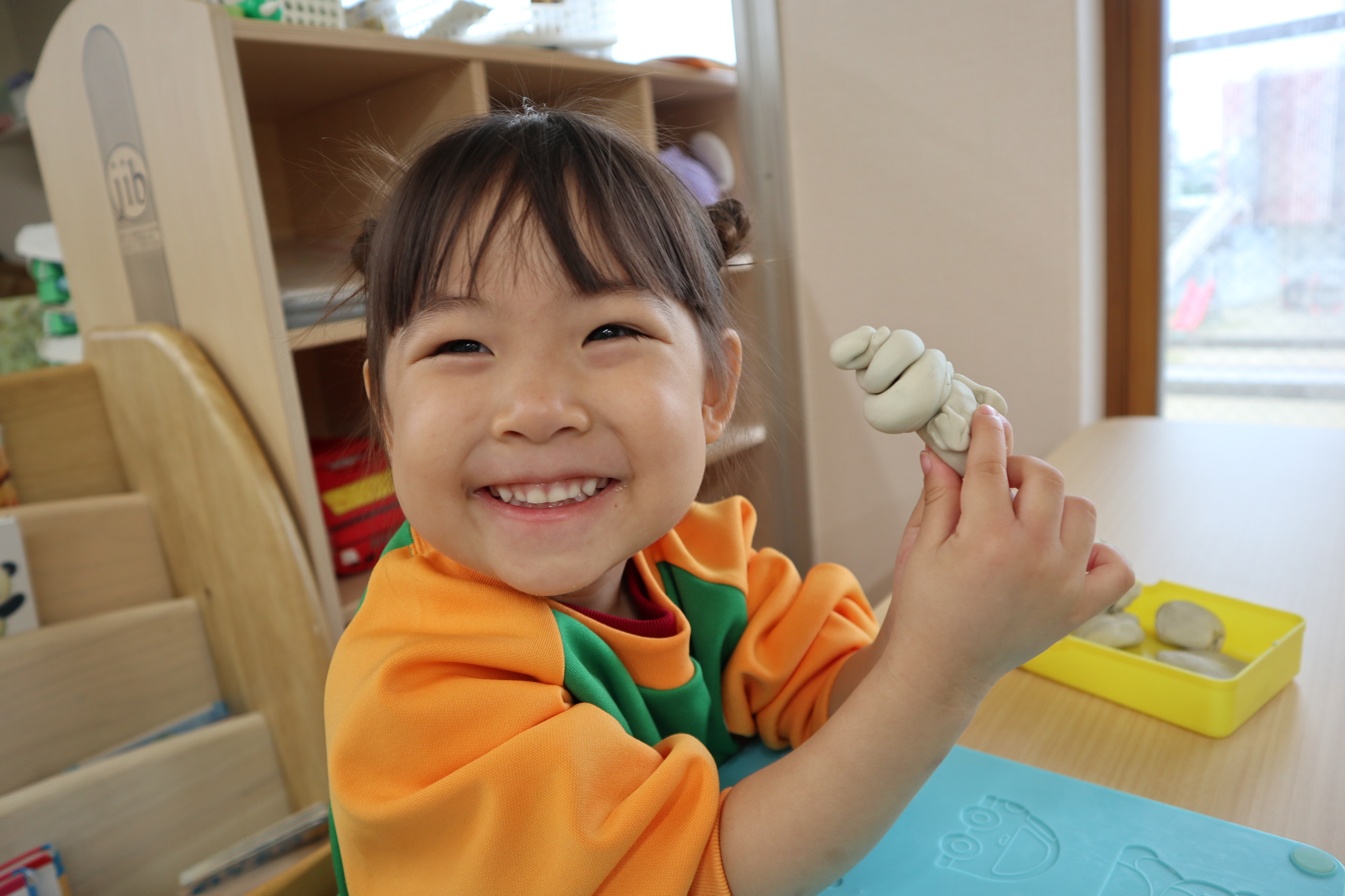 今日保育室で粘土遊びを楽しみました!