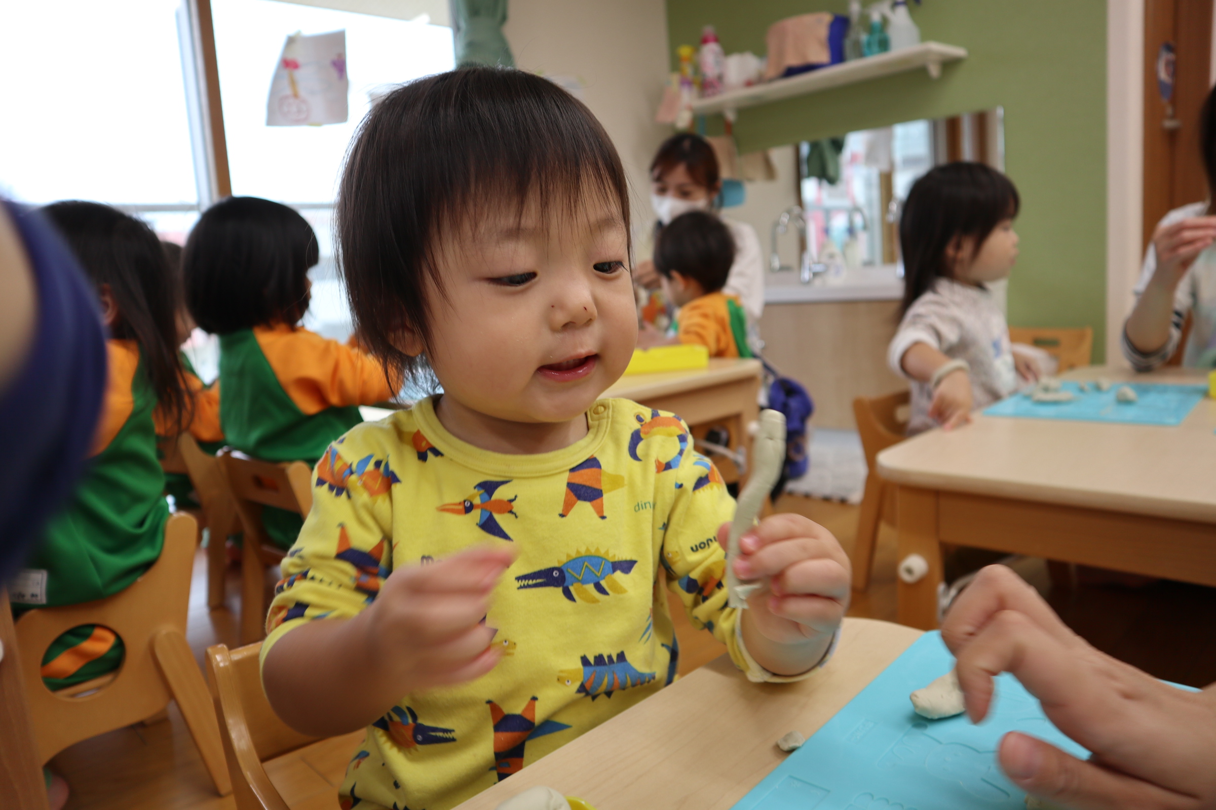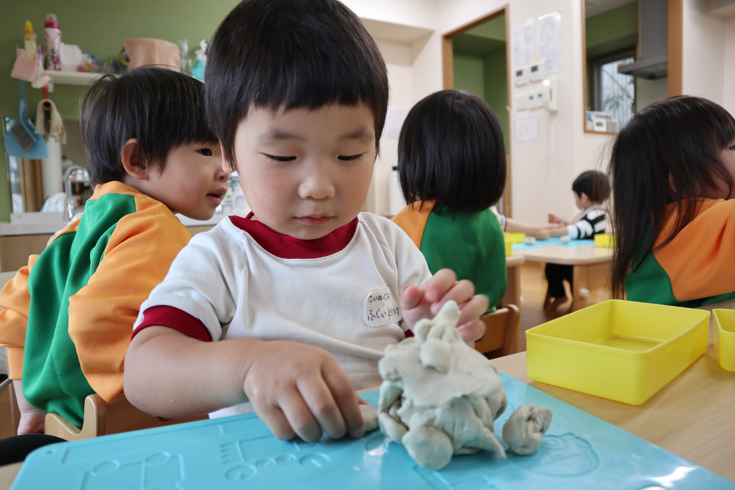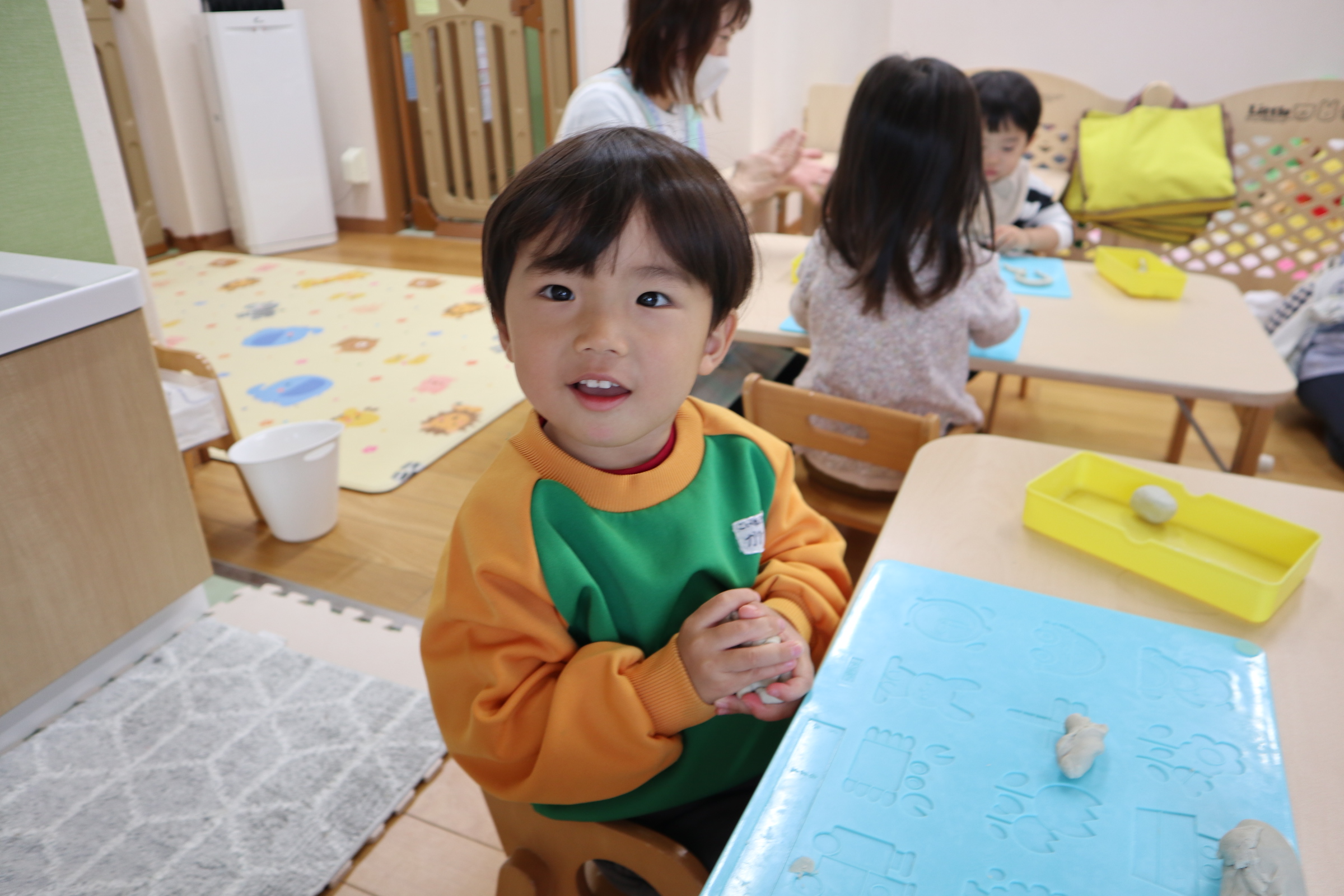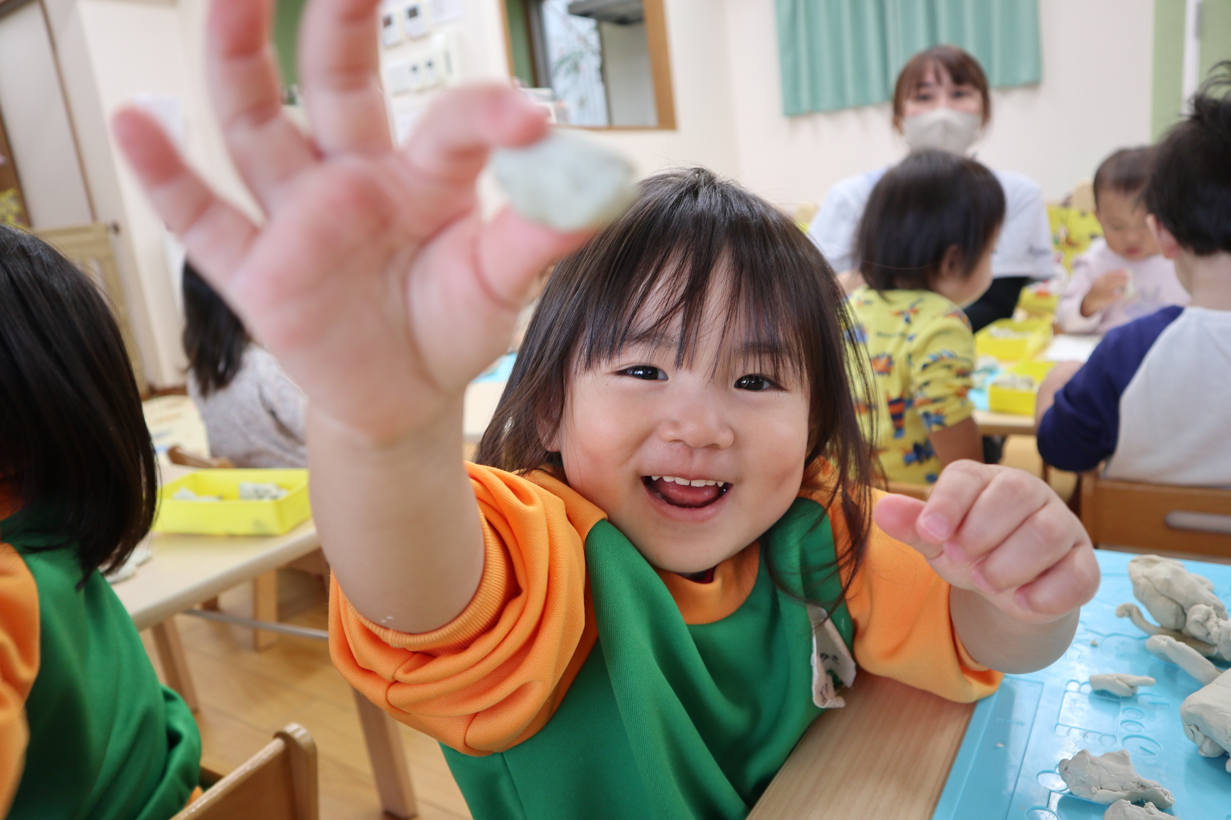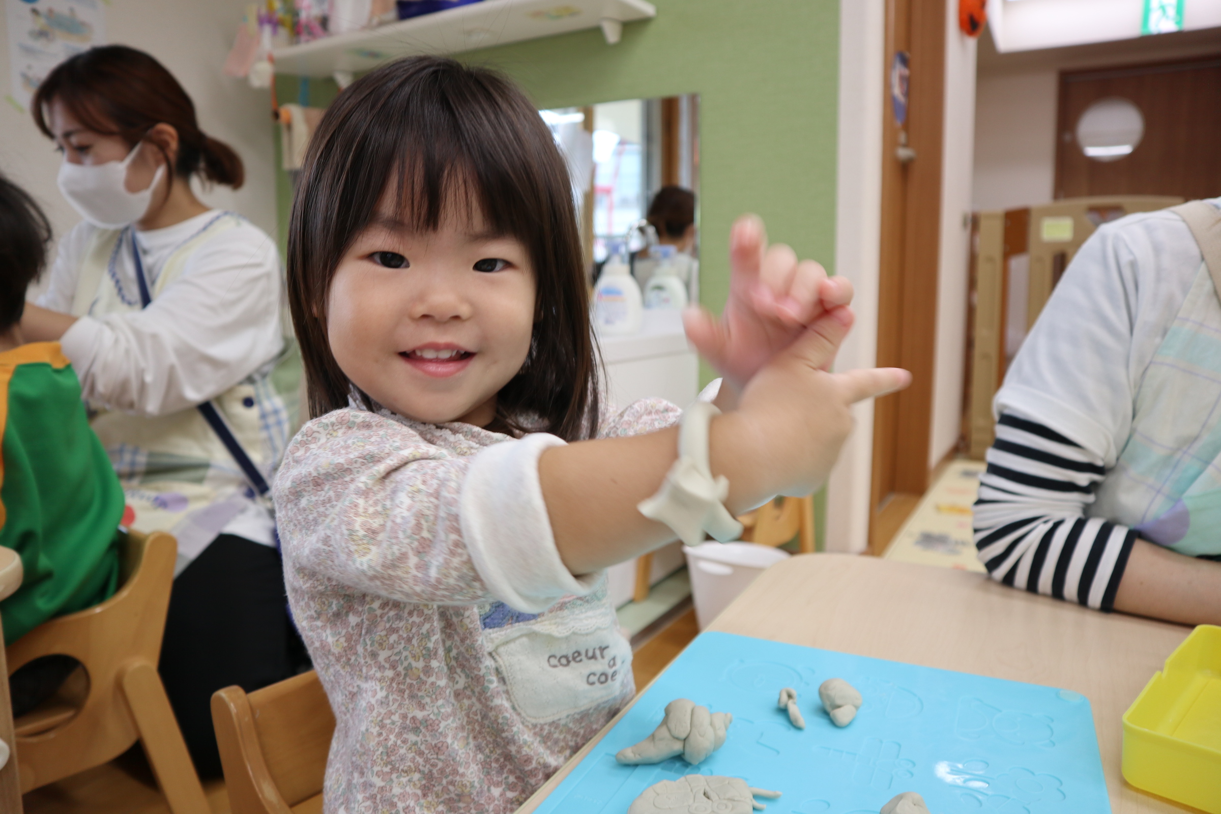 今日保育室で粘土遊びを楽しみました!