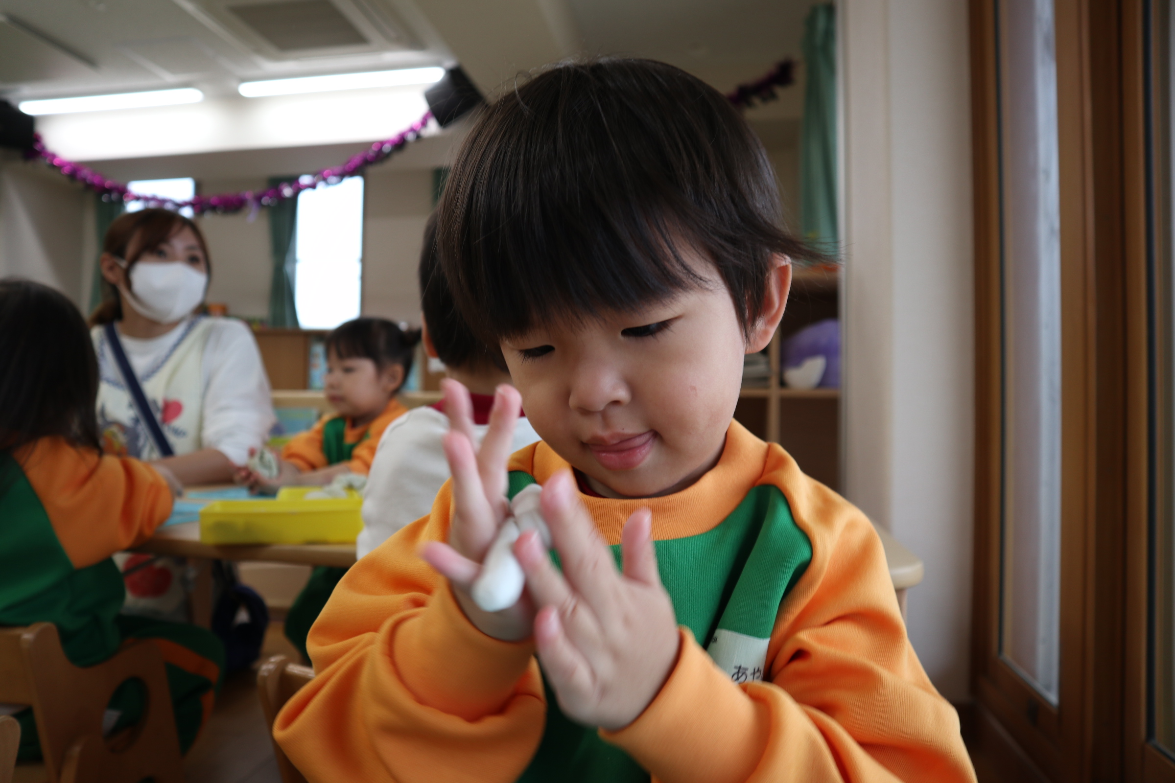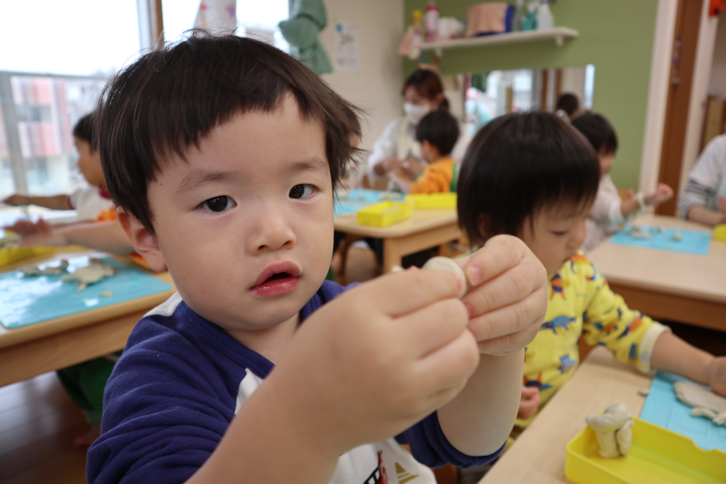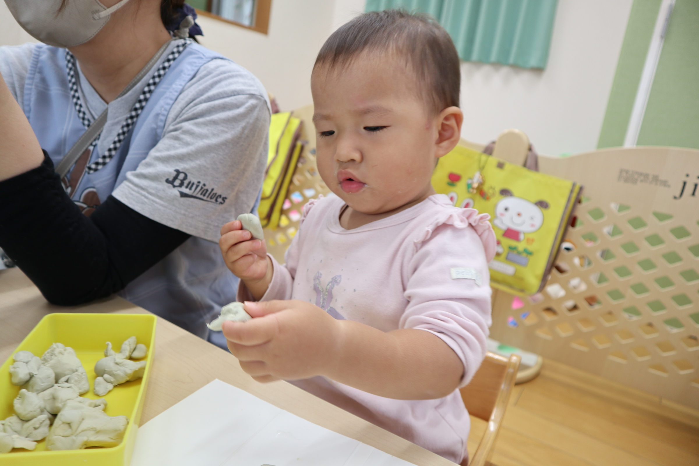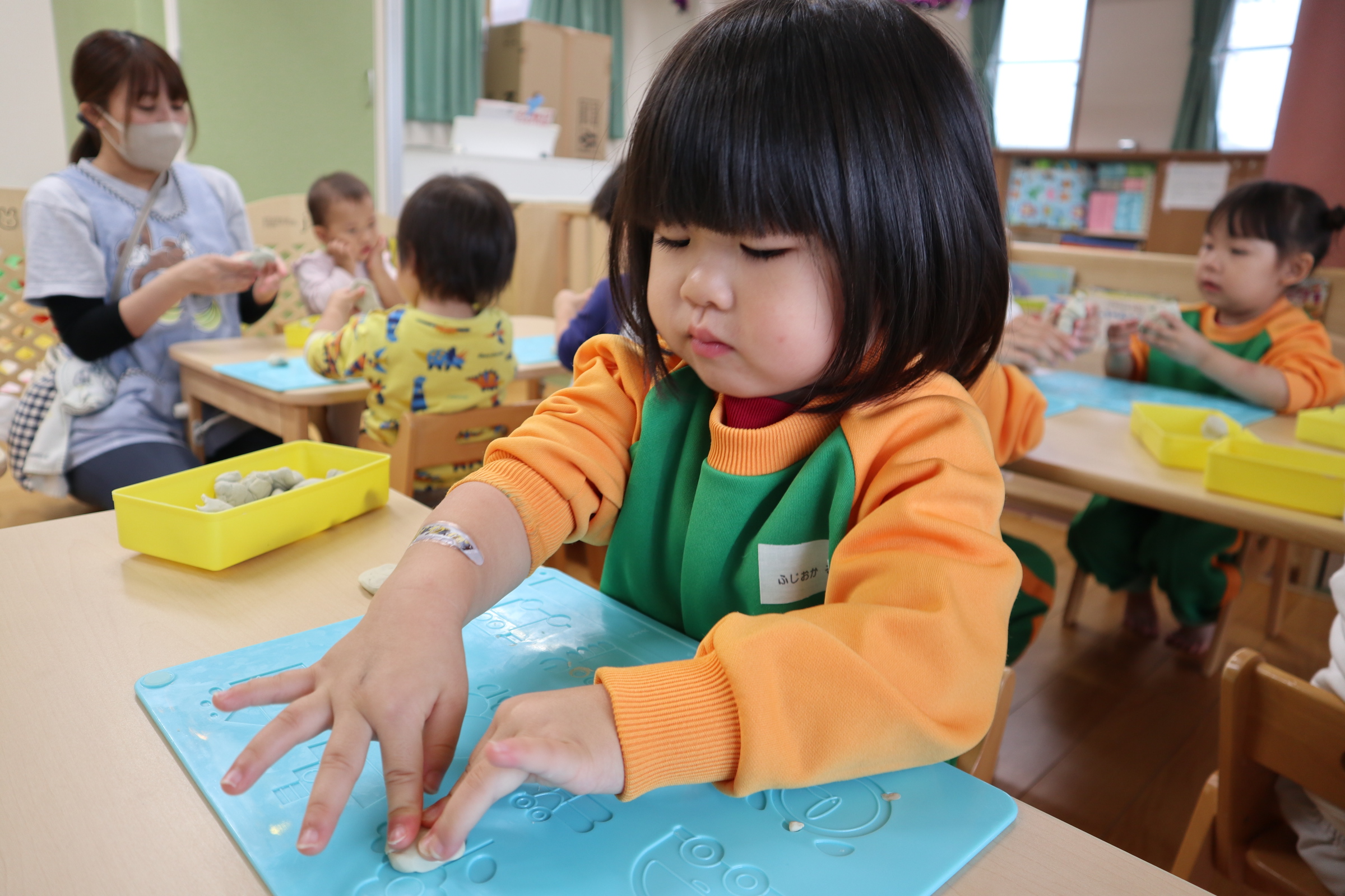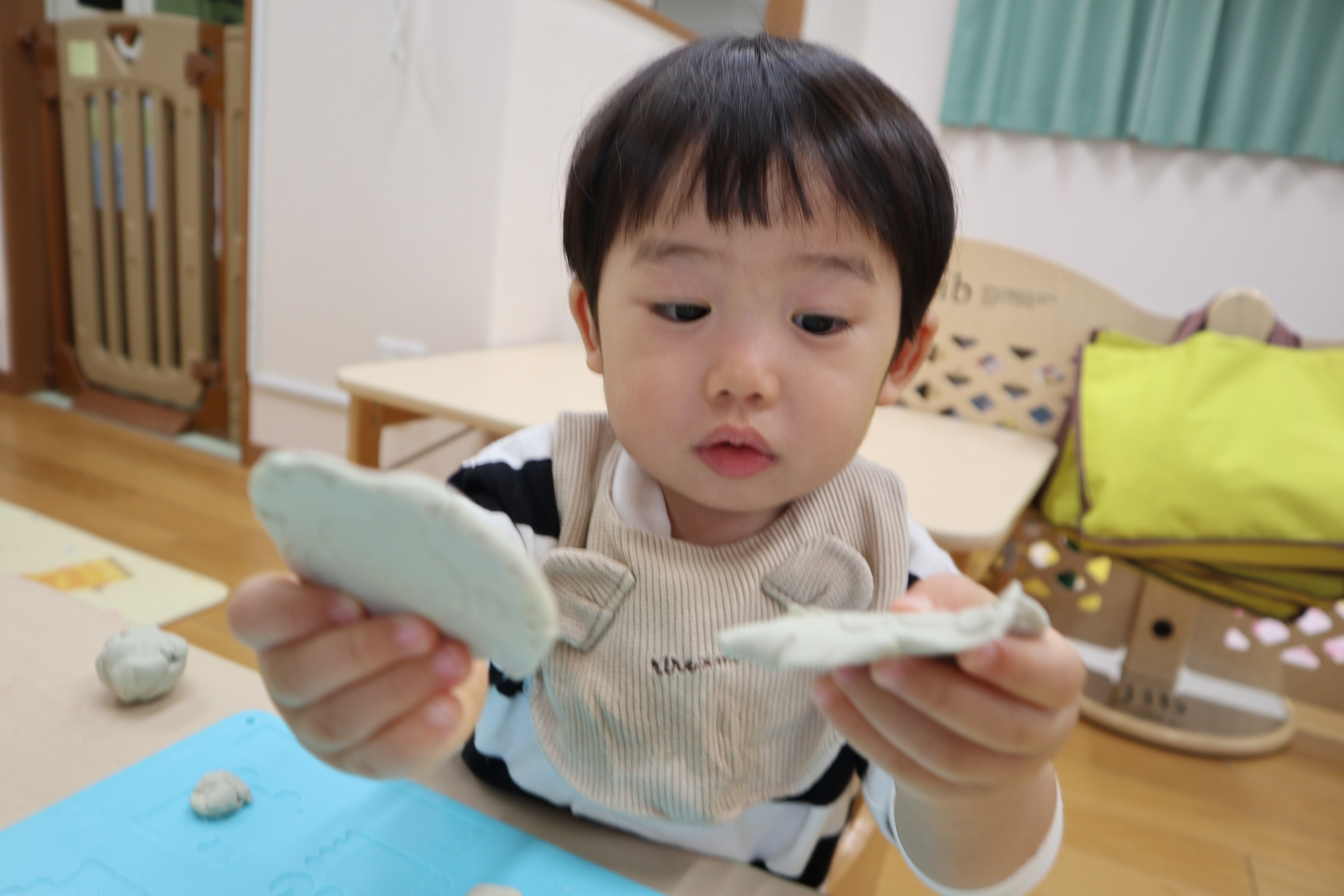 今日保育室で粘土遊びを楽しみました!