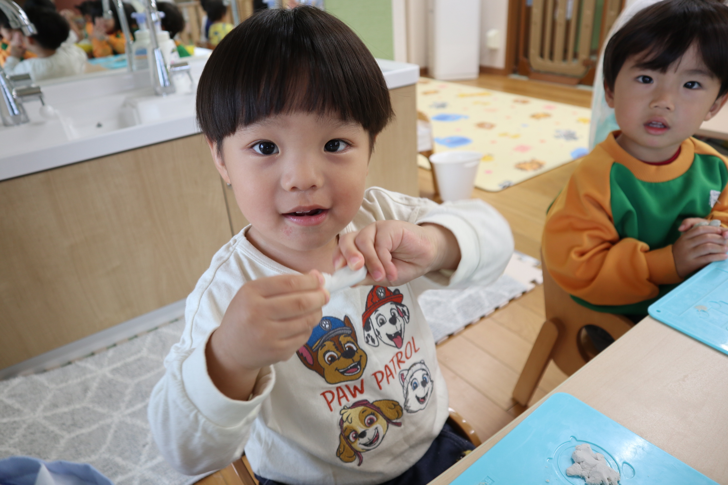 保育者と一緒に、アンパンマンの顔やアイスクリームを作ると「すごーい!見て見て〜!✨」と嬉しそうに友達同士で見せ合う姿も!