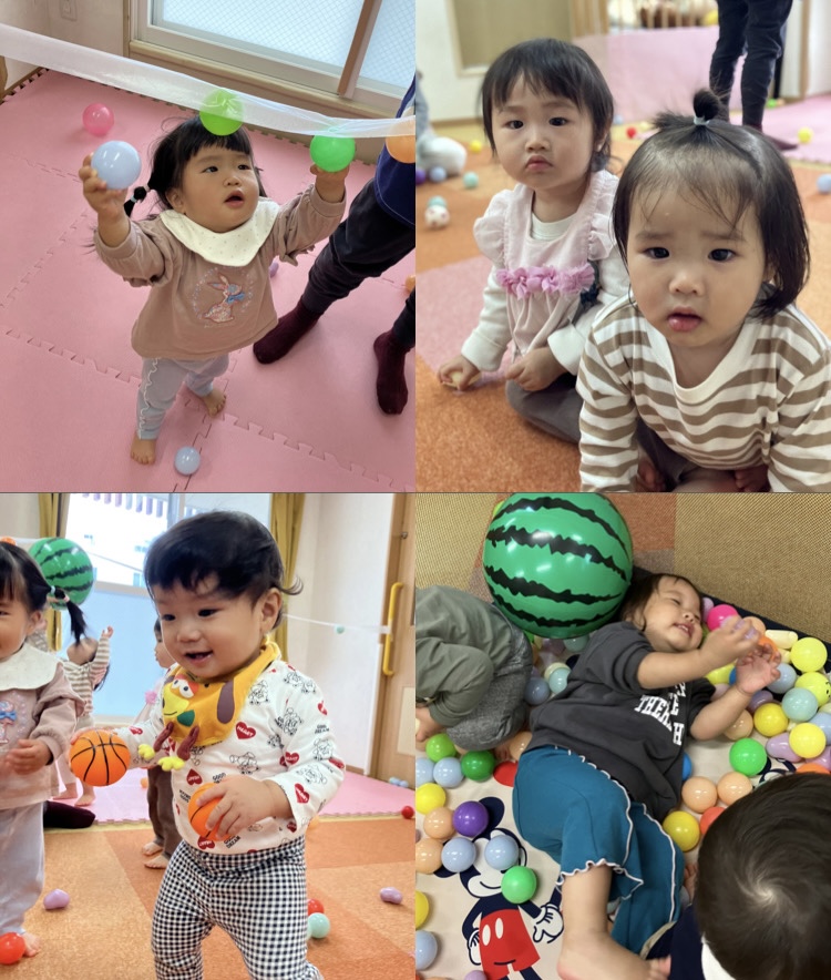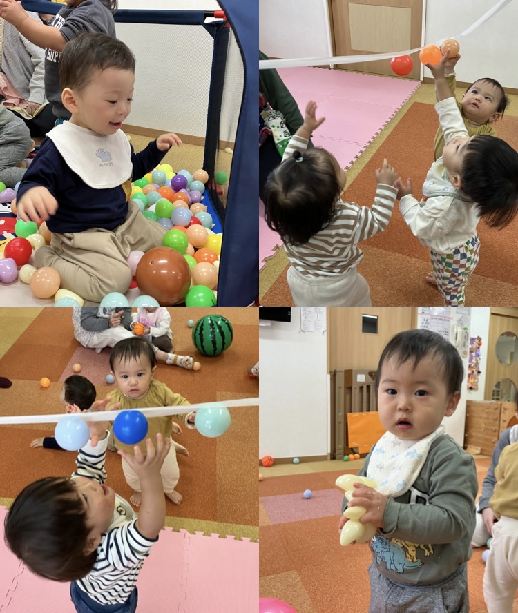 ボールプールやテープに貼り付けたカラーボールに興味津々な子どもたち!♡