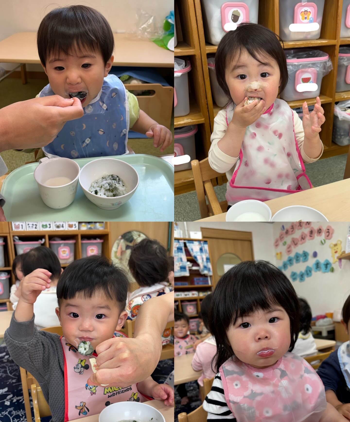 たくさん遊んでお昼寝をした後は、おやつタイム🎵大きなお口を開けてモグモグと食べたり、コップを持ってお茶や牛乳を上手に飲んでいますよ✨