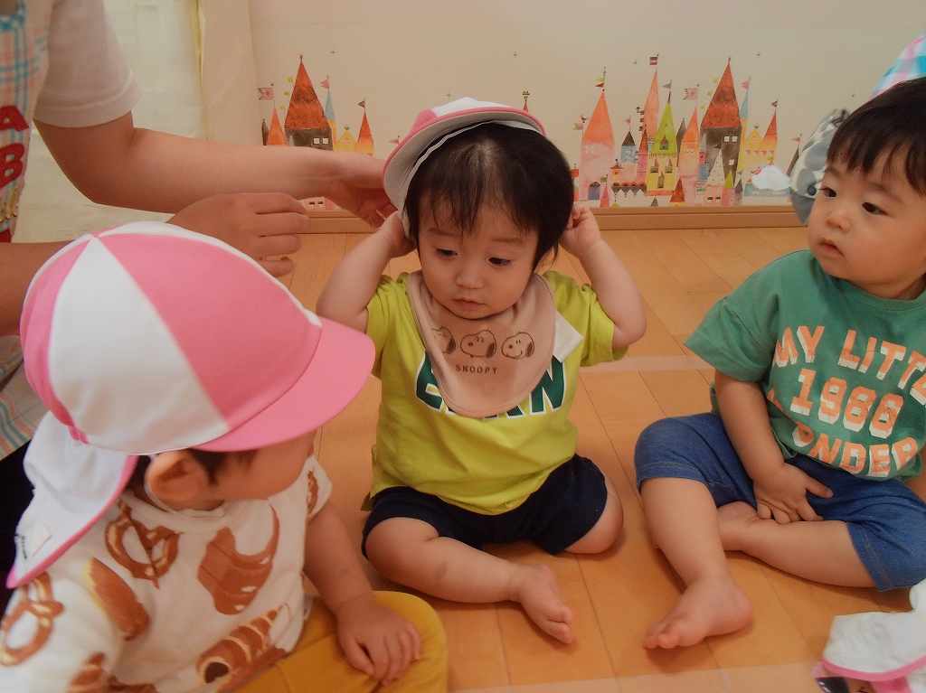 最近のひよこ組さんは、帽子を被る練習をしています!