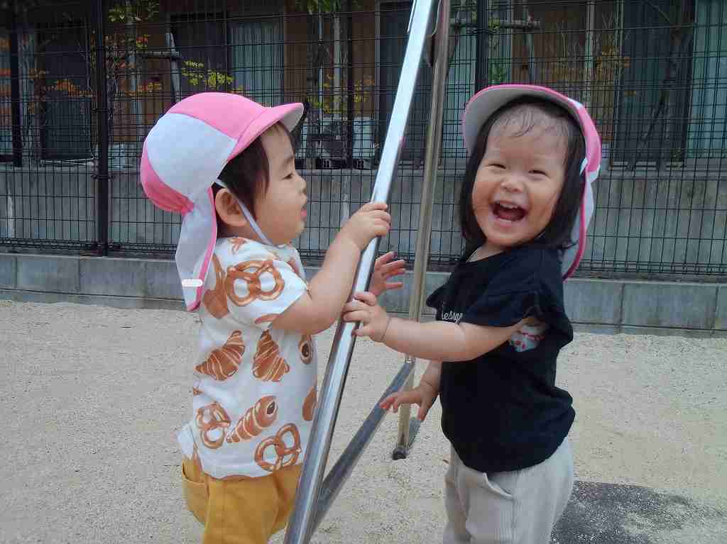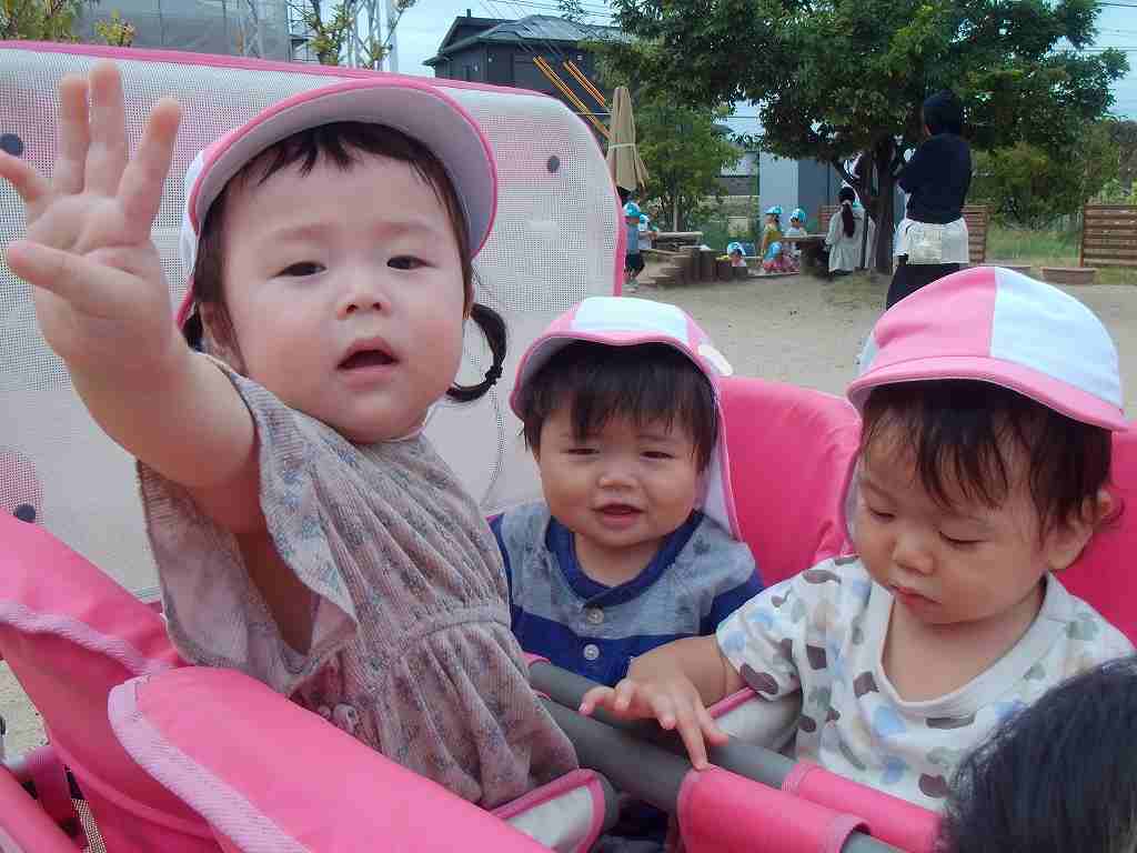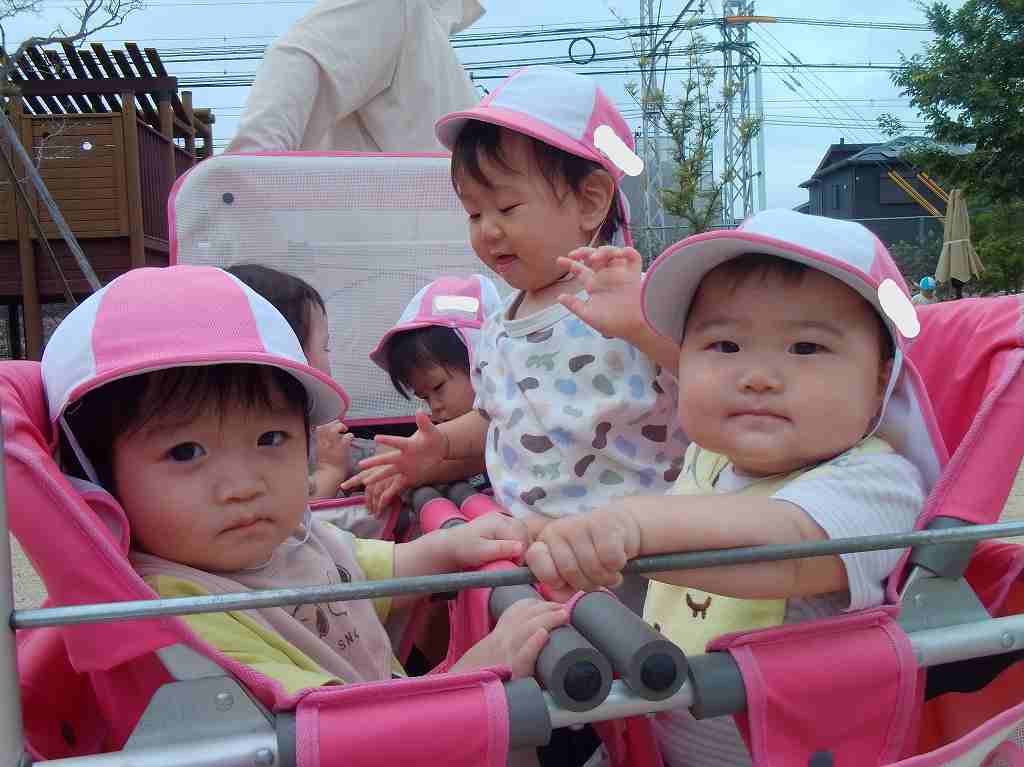帽子を被ったら園庭遊びに出発!お散歩カーに乗って探検したりお気に入りの玩具を探してみたり!歩いて散歩したりお友達と関わってみたり、、、と楽しそうに遊んでいるひよこ組さん^^