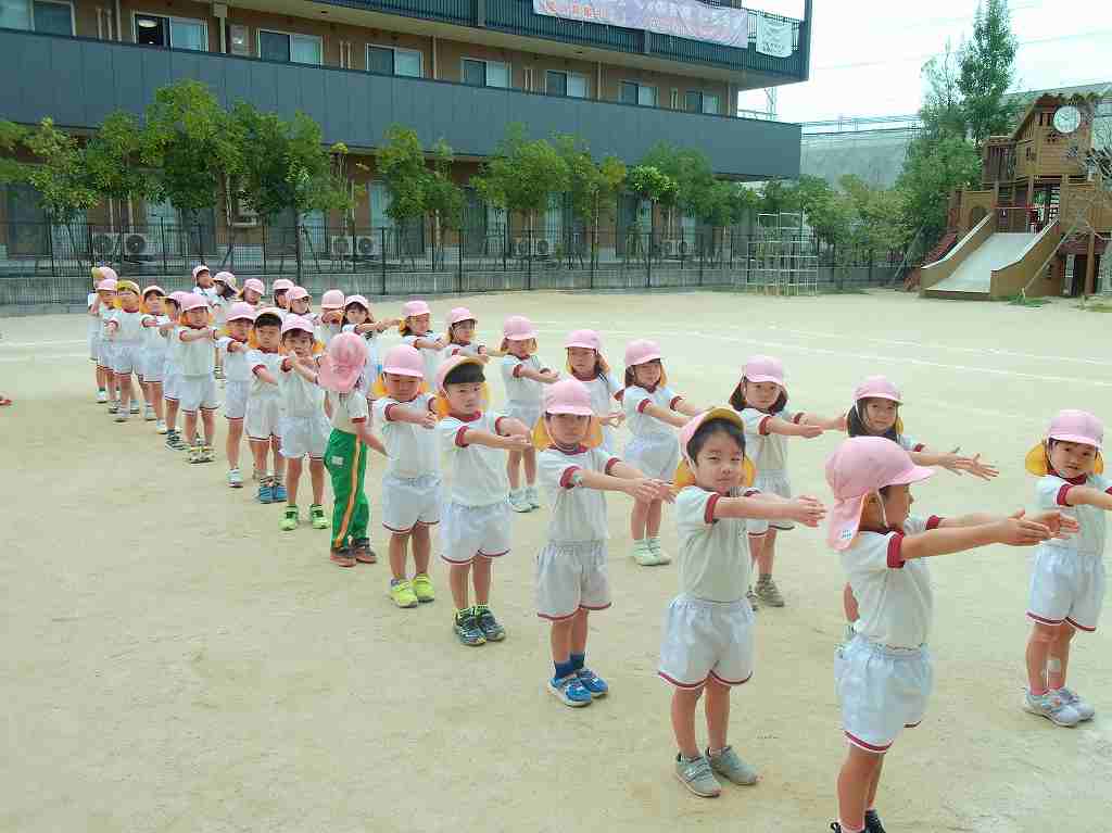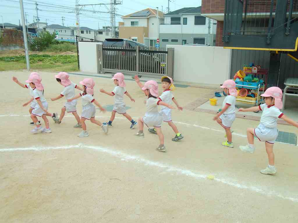 どのようにするとかっこよく行進したり、まっすぐに整列をしたりすることが出来るかを子どもたちと話すと、「ぴんって指までのばす!」「前のお友達を見て歩く」「肩まで手をあげてまえにならえをする」などの声が聞こえてきました!