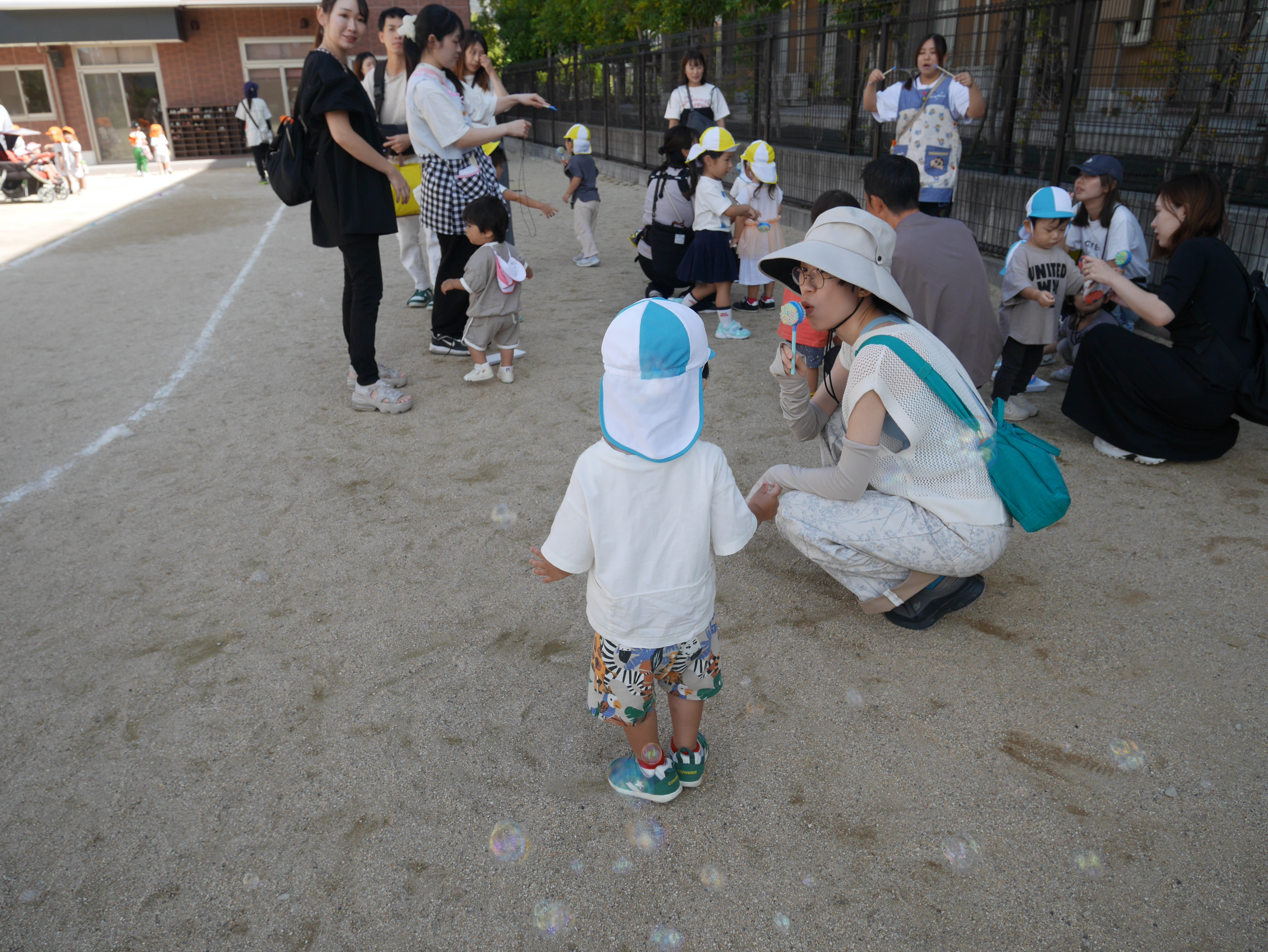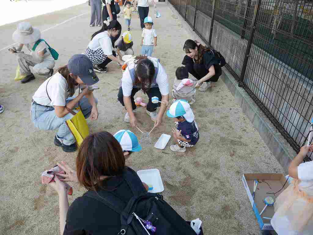 しゃぼん玉ができると追いかけたり、じーと興味津々で見ている姿がとっても可愛かったです♡先生たちと一緒に大きなしゃぼん玉作りに挑戦したり、自分で吹こうと挑戦している子もいましたよ♡大型遊具ではロープを自分で登ってトランポリンや滑り台を楽しむ姿がありました☆彡