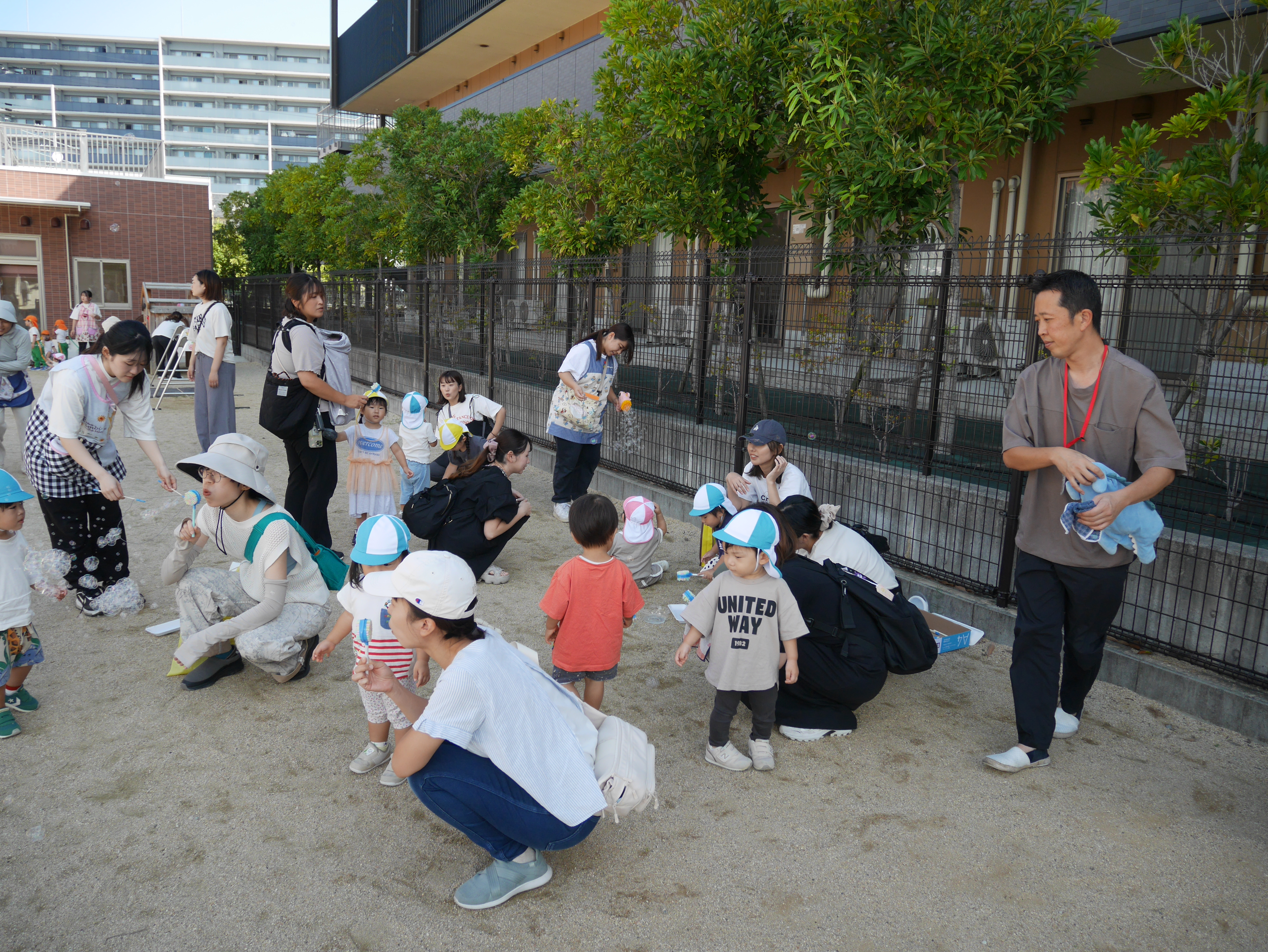 今日は園庭にでて、遊具で遊んだり、しゃぼん玉で遊びましたよ♪