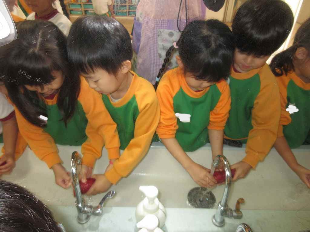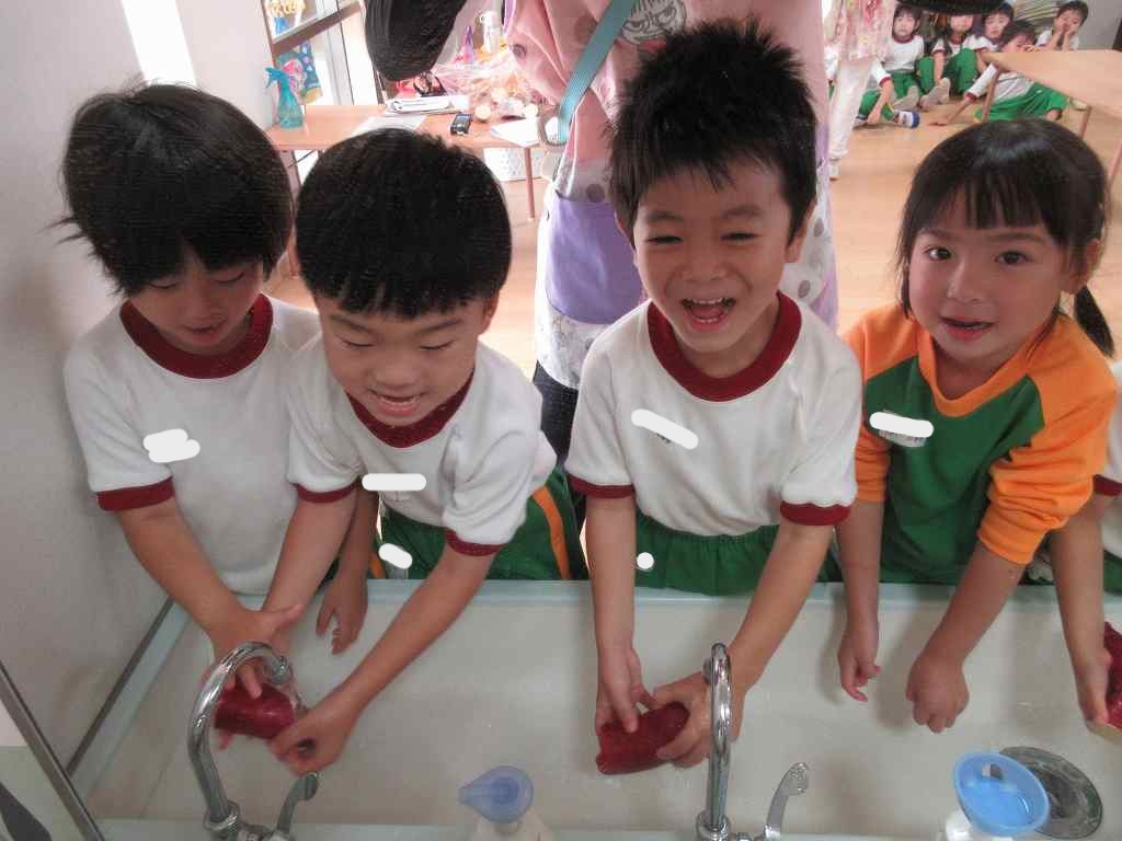 年中組さんはさつまいもをきれいに洗いました!「きれいに洗ったら美味しくなるかなあ」「洗ってたらつるつるしてきた!」とお友達と協力してさつまいもを洗いましたよ♪