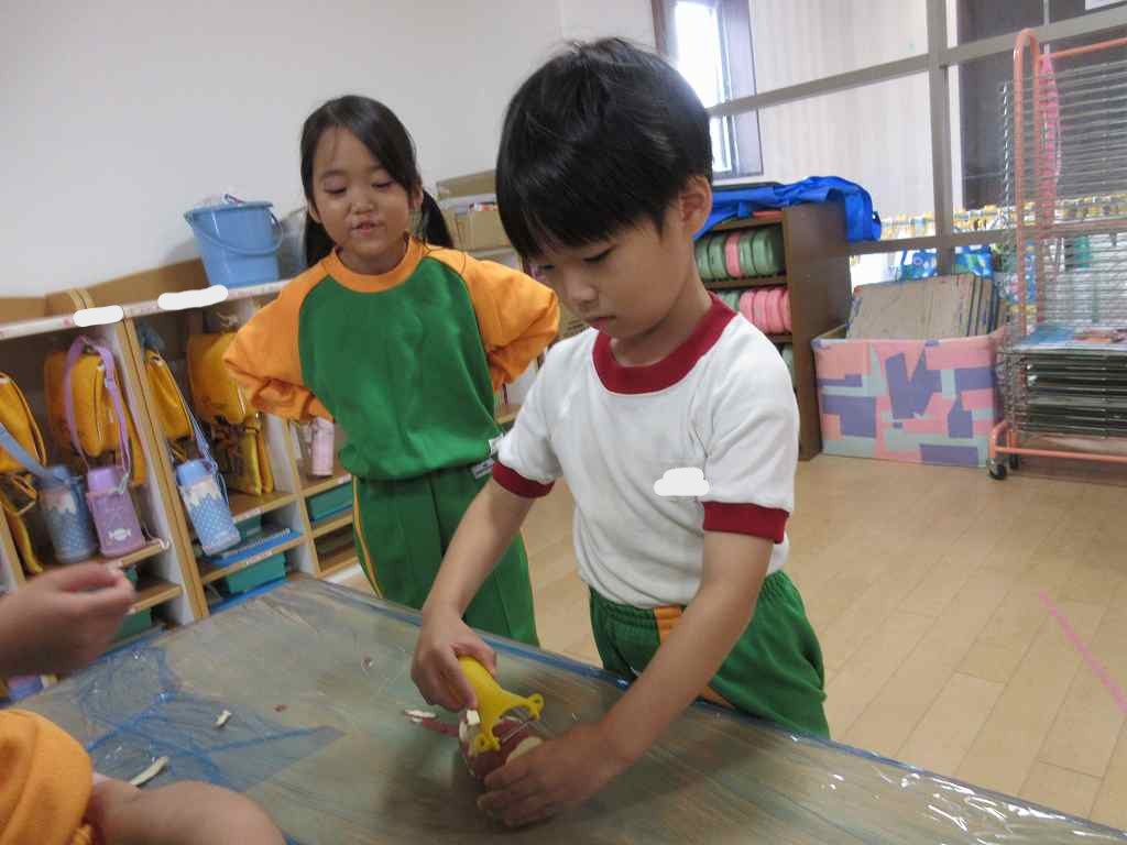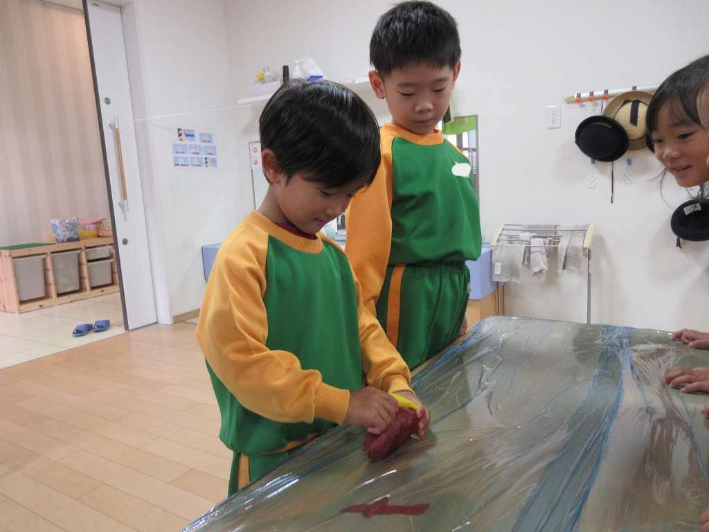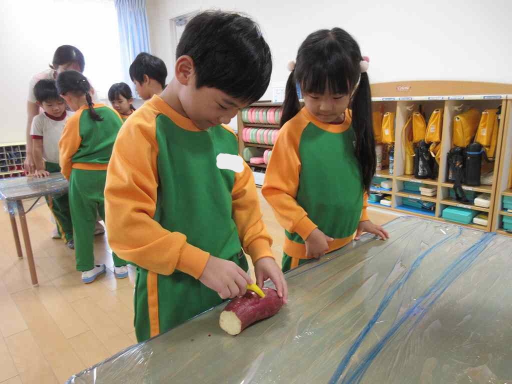 「さつまいもだいすきやから頑張る!」「これ夜までかかりそう~」と言いながら最後まで丁寧に皮を剥くことが出来ました!