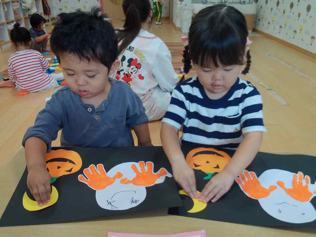 手形をしたり糊を使ってカボチャの顔のパーツやお月さまやお星さまを貼ったりしましたよ!
