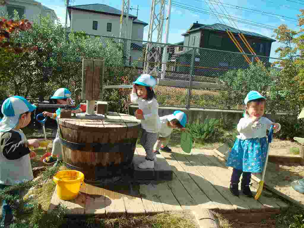 ビオトープのポンプも大人気でバケツに入れたり、様々な遊びをしています♡