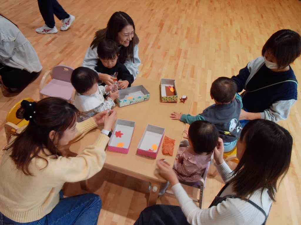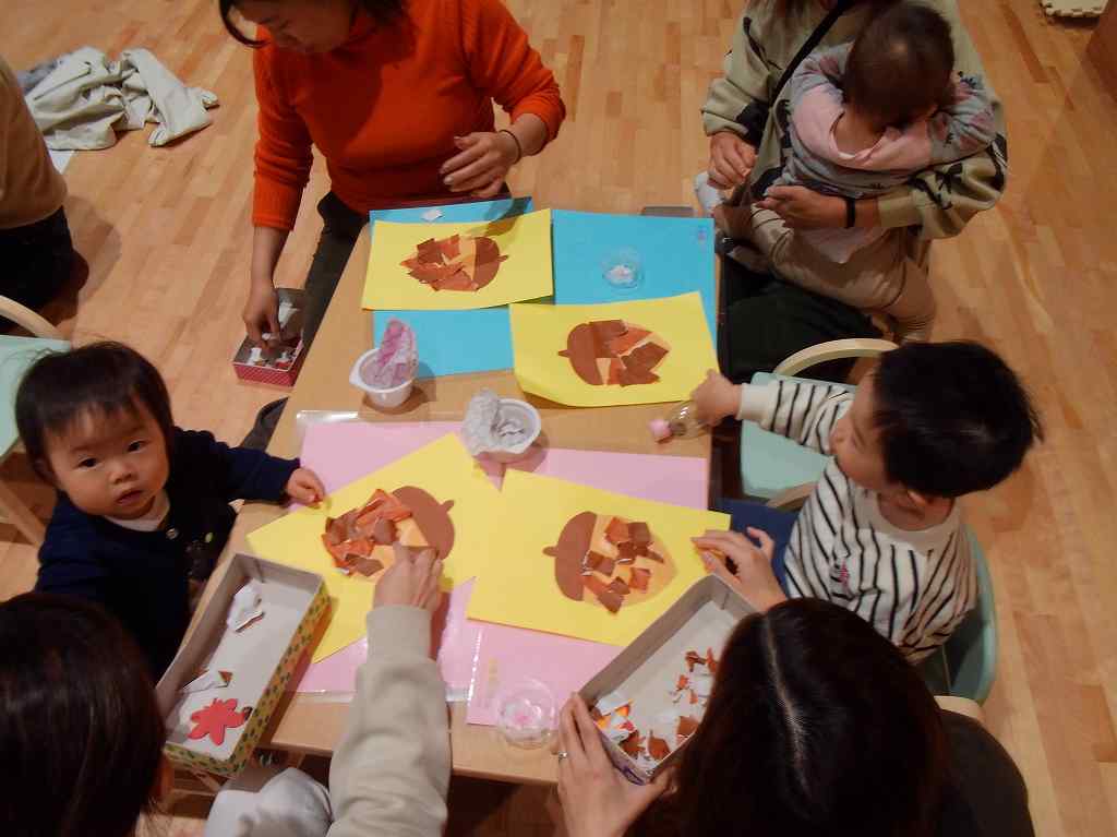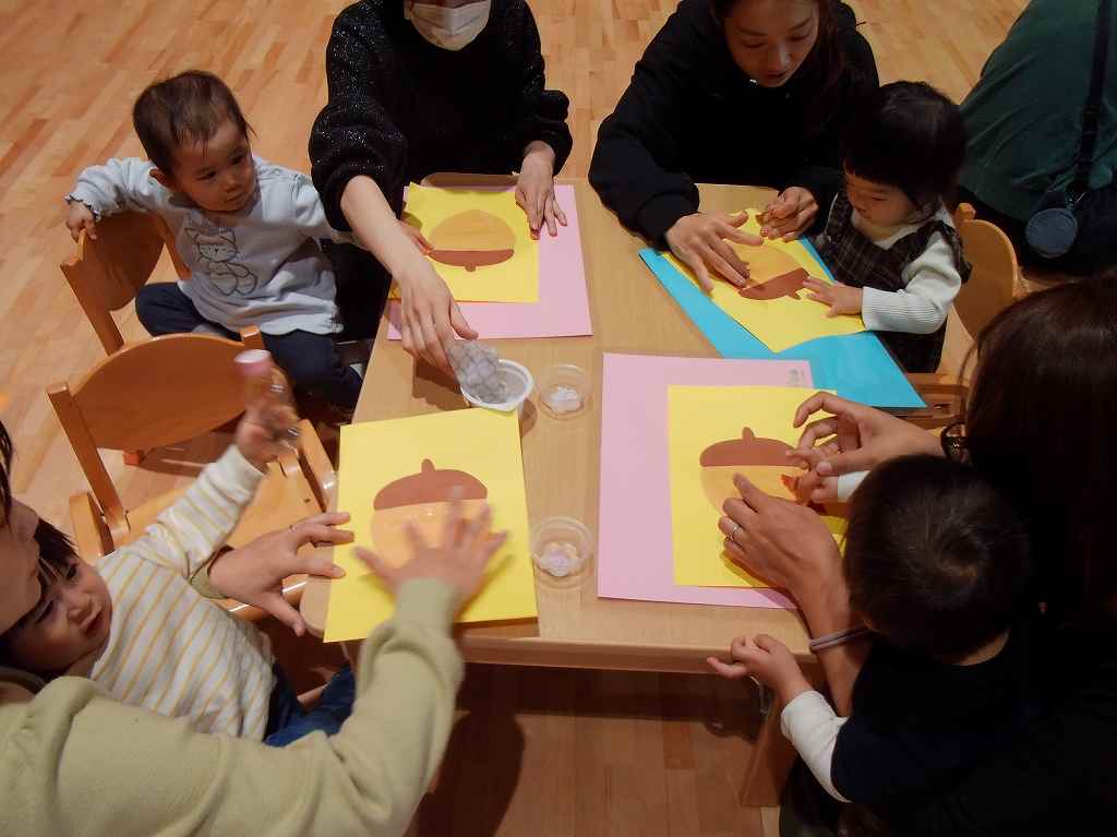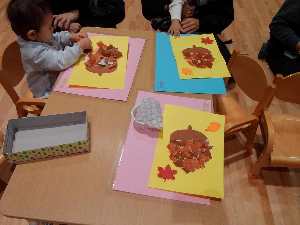 どんぐりの制作では、折り紙をくしゃくしゃしたり、ビリビリ破る音を楽み、制作を楽しみました♪