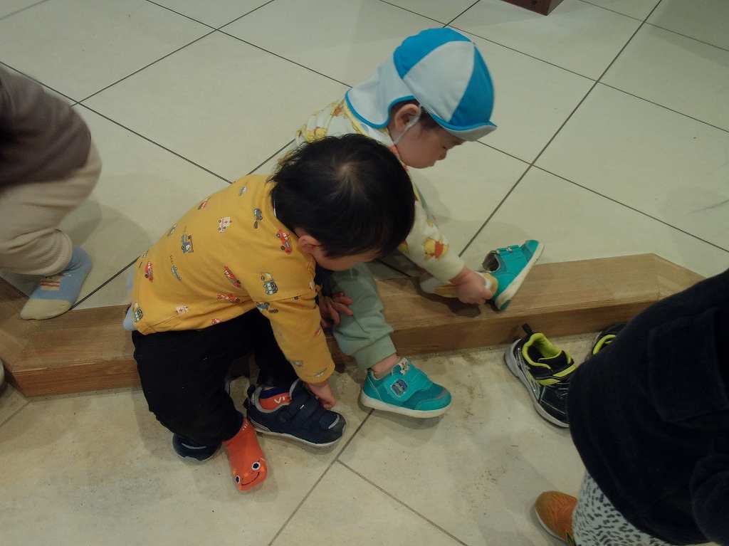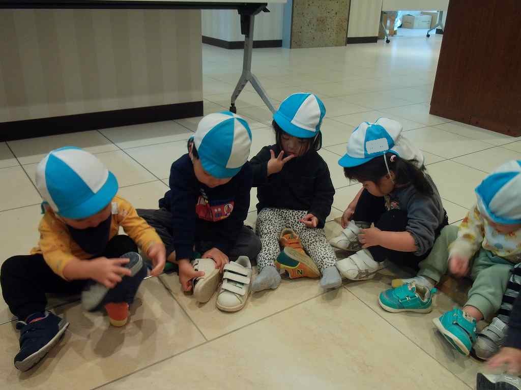 まずは園庭に行く前に自分で頑張って靴下、靴、帽子を被っているあひる1組さん!両手をしっかり使い上手に履くことが出来るようになってきましたよ☆彡できたらお壁ぺったんで座り、頑張っているお友達を待っています♪みんな揃ったら電車ガッチャンで出発して園庭に遊びに行きます❀