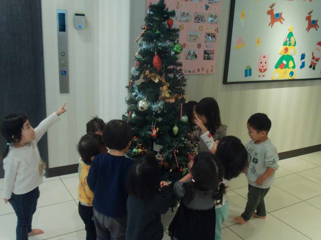 園庭から戻ると12月から設置されているクリスマスツリーをみんなで見ました★「ジングルベ~ル♩」と歌を歌ったり、ツリーのオーナメントを見て「きらきらだね~」や「サンタさんいるー!」とお話している子ども達もいましたよ♡お部屋に戻ってからもクリスマスのお話をしていてすっかりクリスマス気分のあひる1組さんです♬