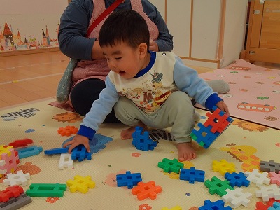 ブロックで遊んでいる時は、先生と一緒に「ぎゅっぎゅっ」と組み立てたり、ブロックで作ったバックを持って嬉しそうに「見て見て~!」と色々な先生に見せに回ったりして楽しそうに遊んでいる姿がとても可愛いです♡