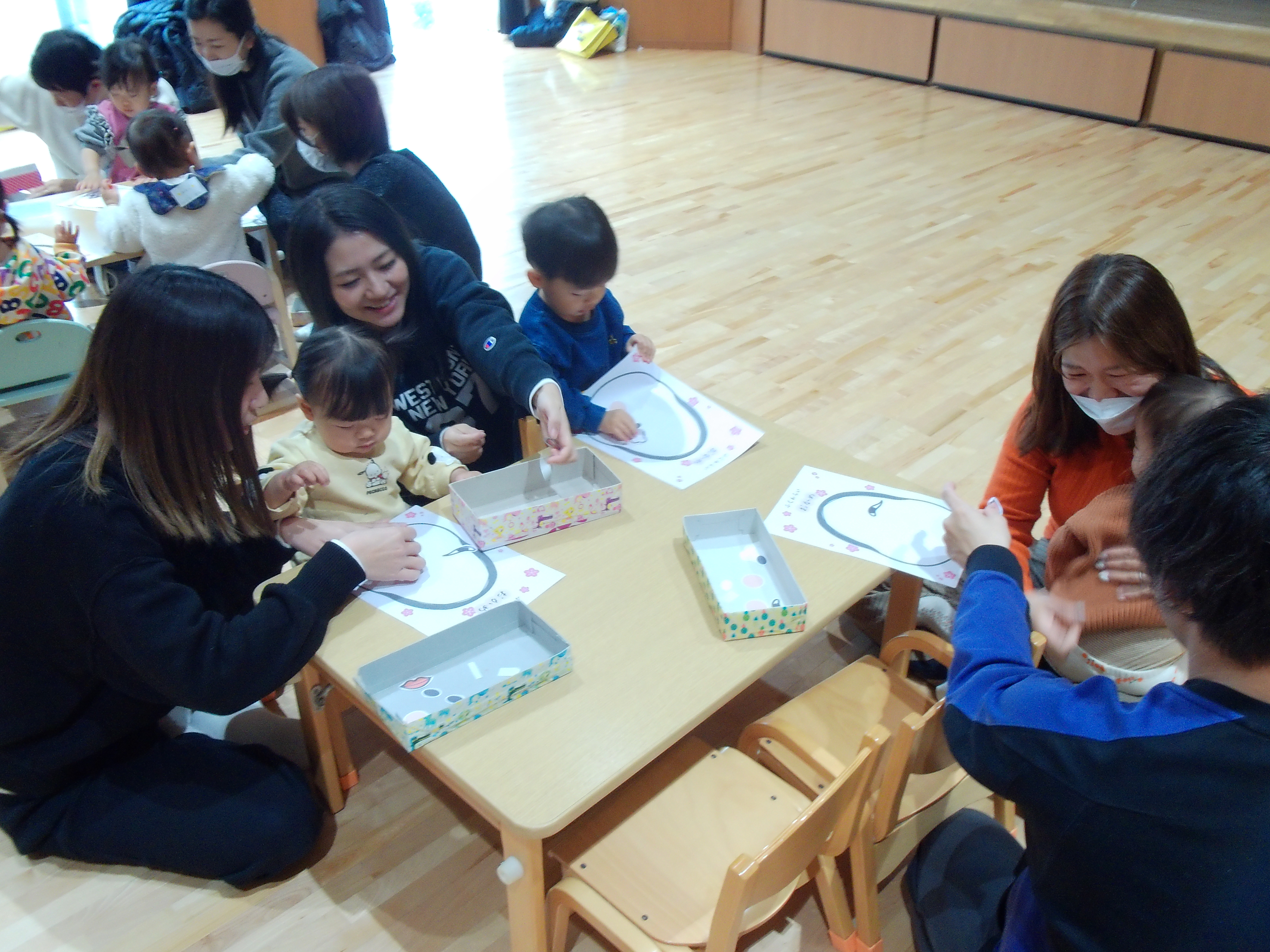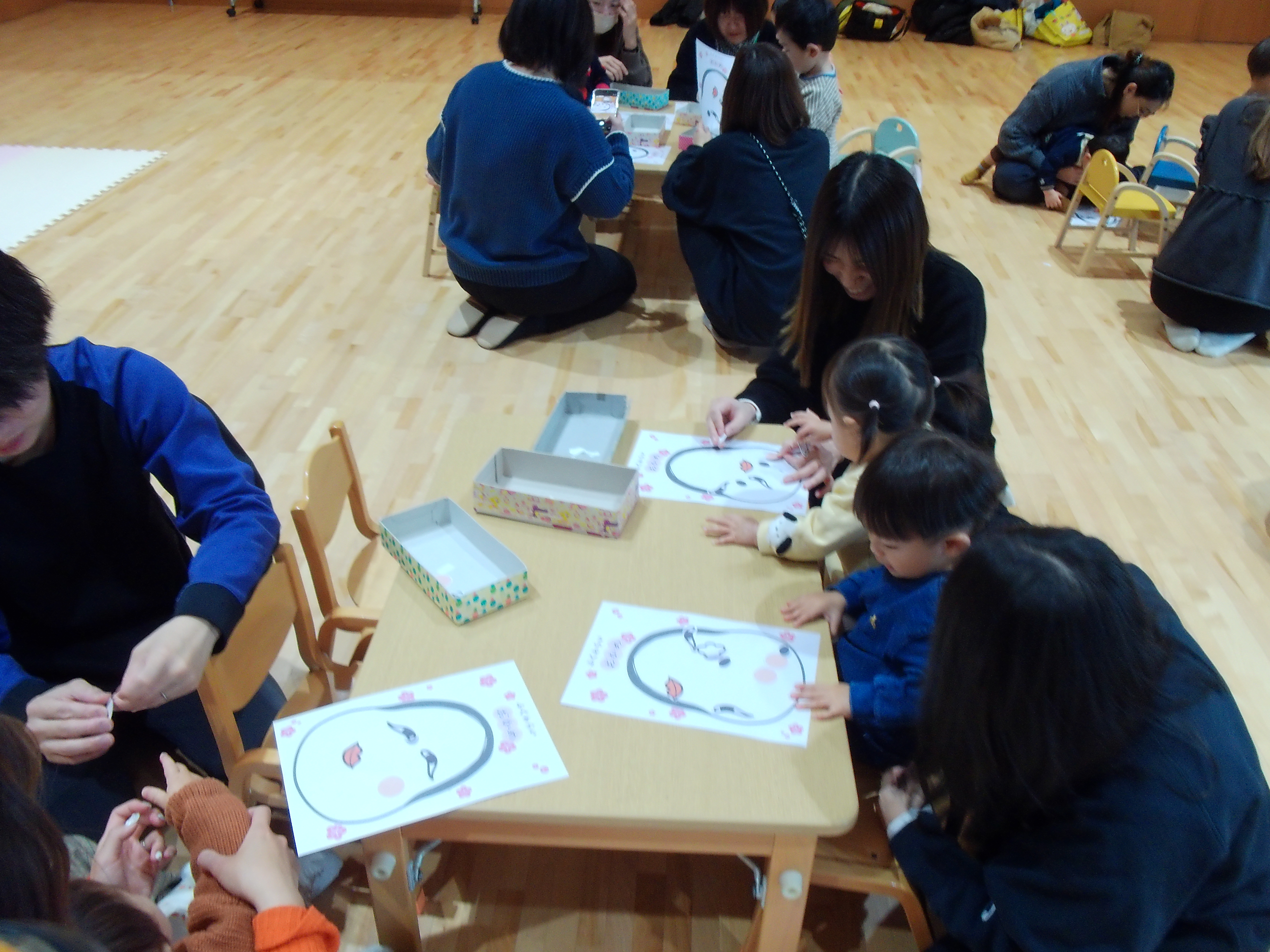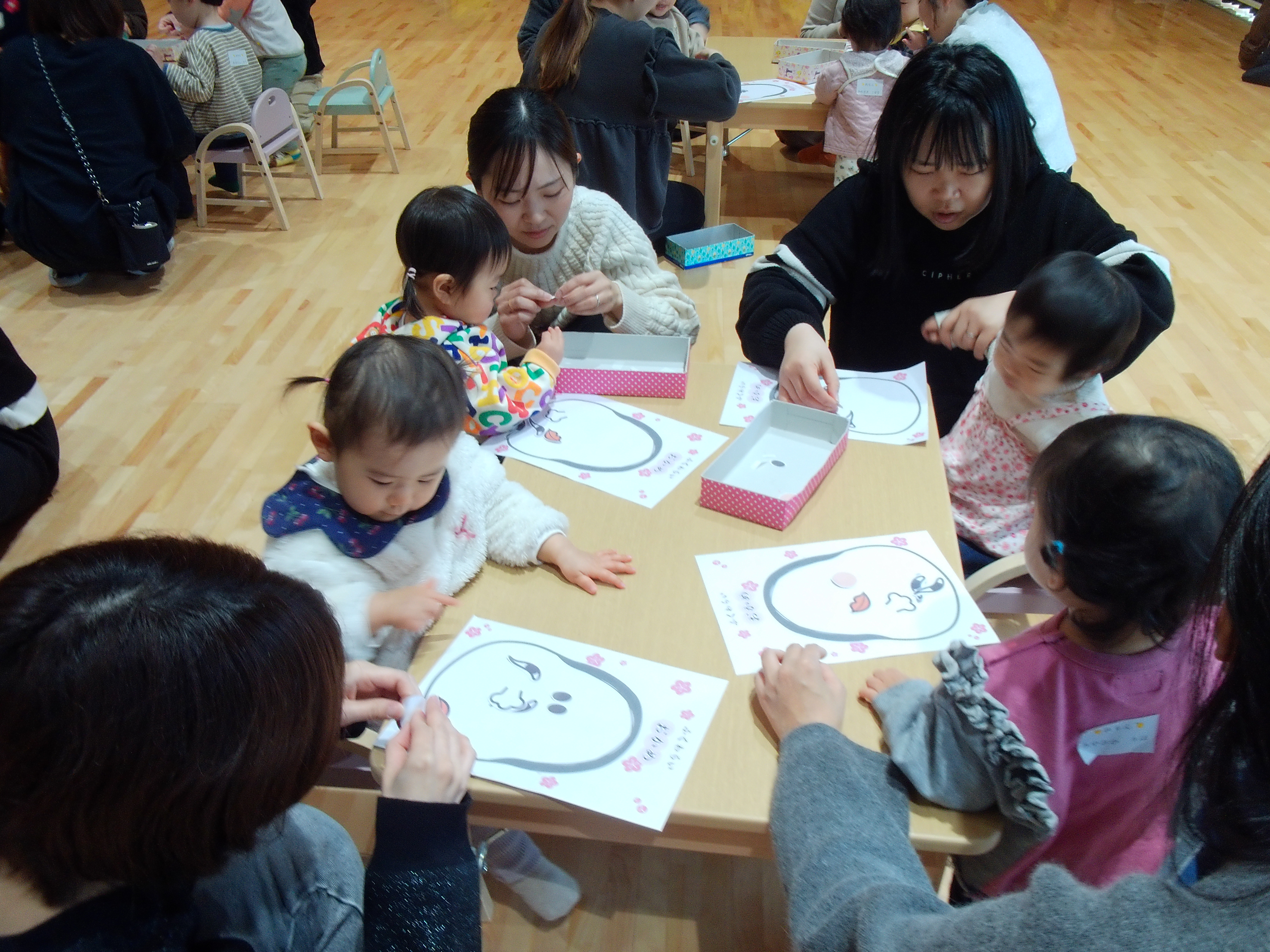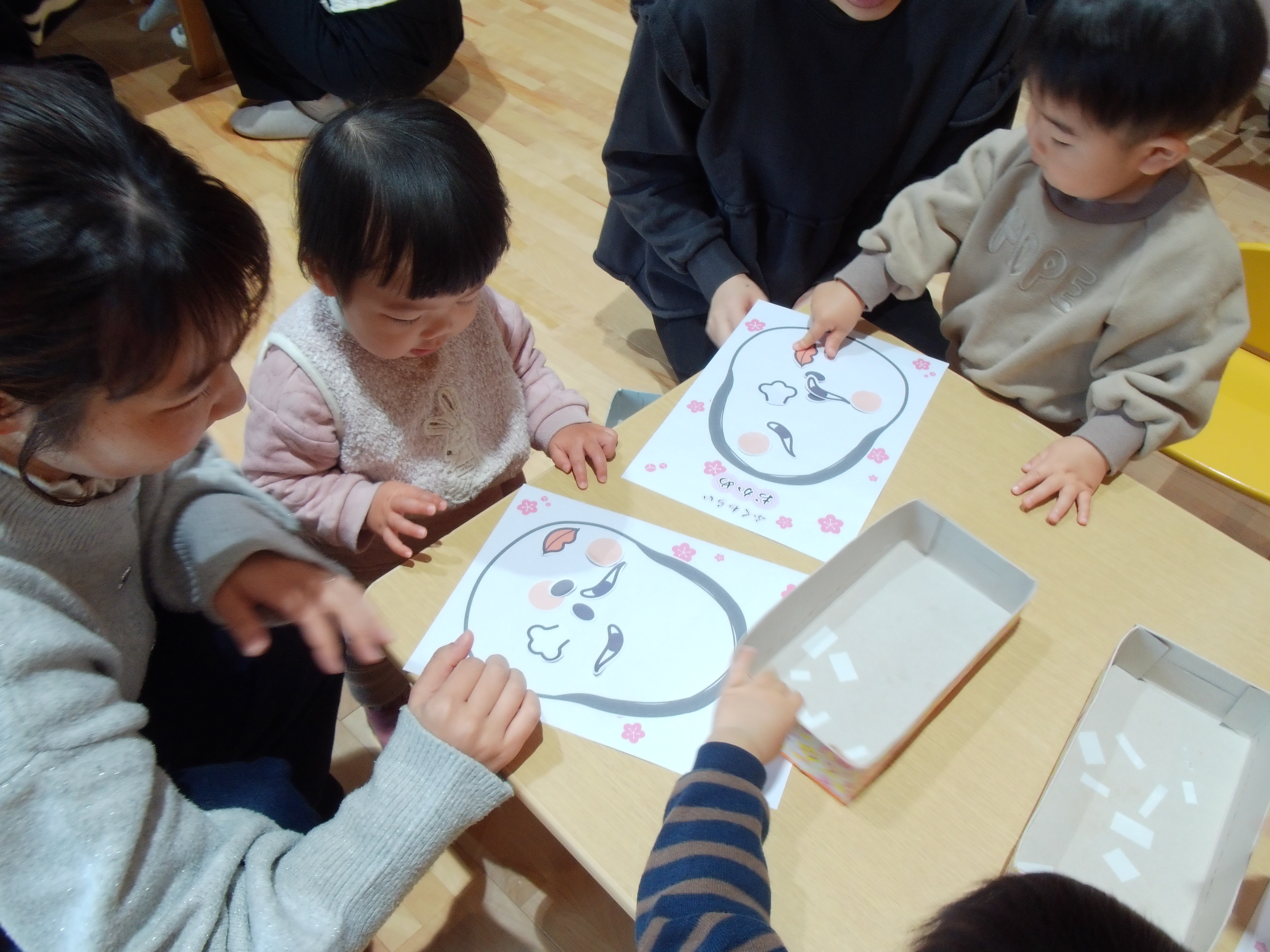 今日のれもん組では、お正月遊びの「福笑い」をしました!好きなところに顔のパーツをペタペタ♪それぞれ個性的なお顔が出来上がりましたよ!おもちゃ遊びの際はお片付けが上手にできるお友達がたくさんでとってもかっこよかったです☆