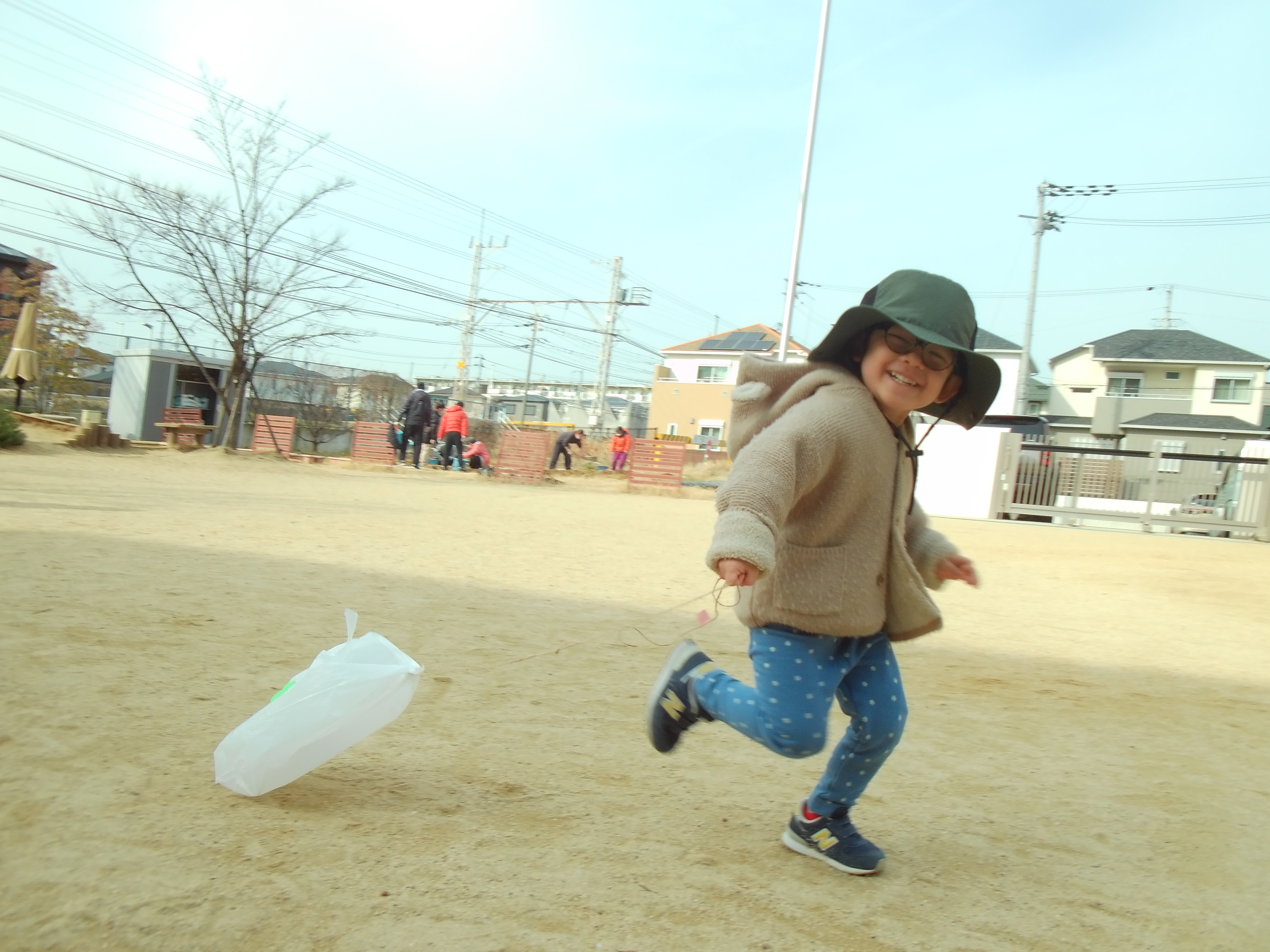 紐を通して、いよいよ完成!園庭にでて早速たこあげに挑戦しましたよ♪