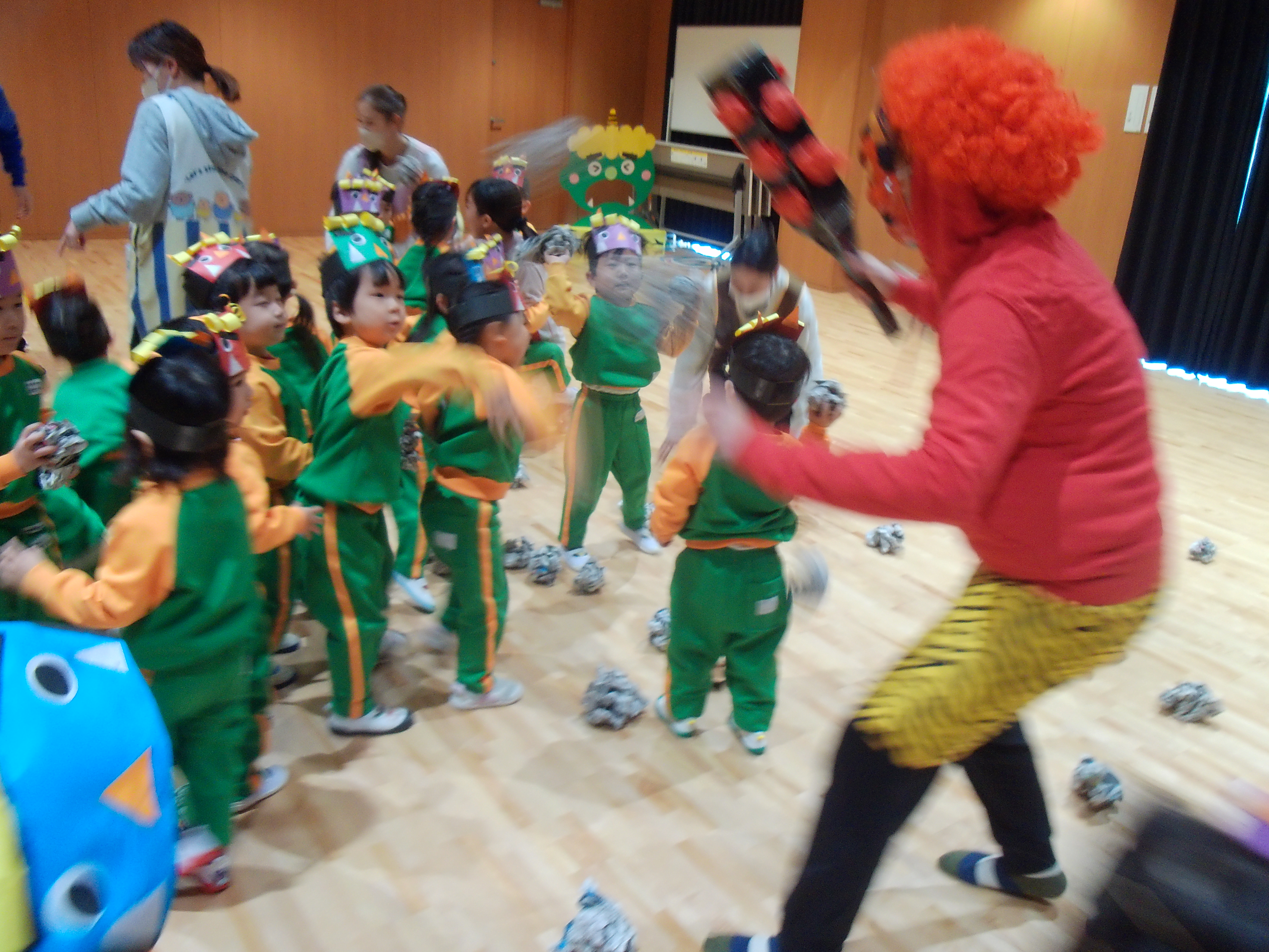 赤鬼さんと青鬼さんが登場すると、新聞紙の豆を使って鬼退治!