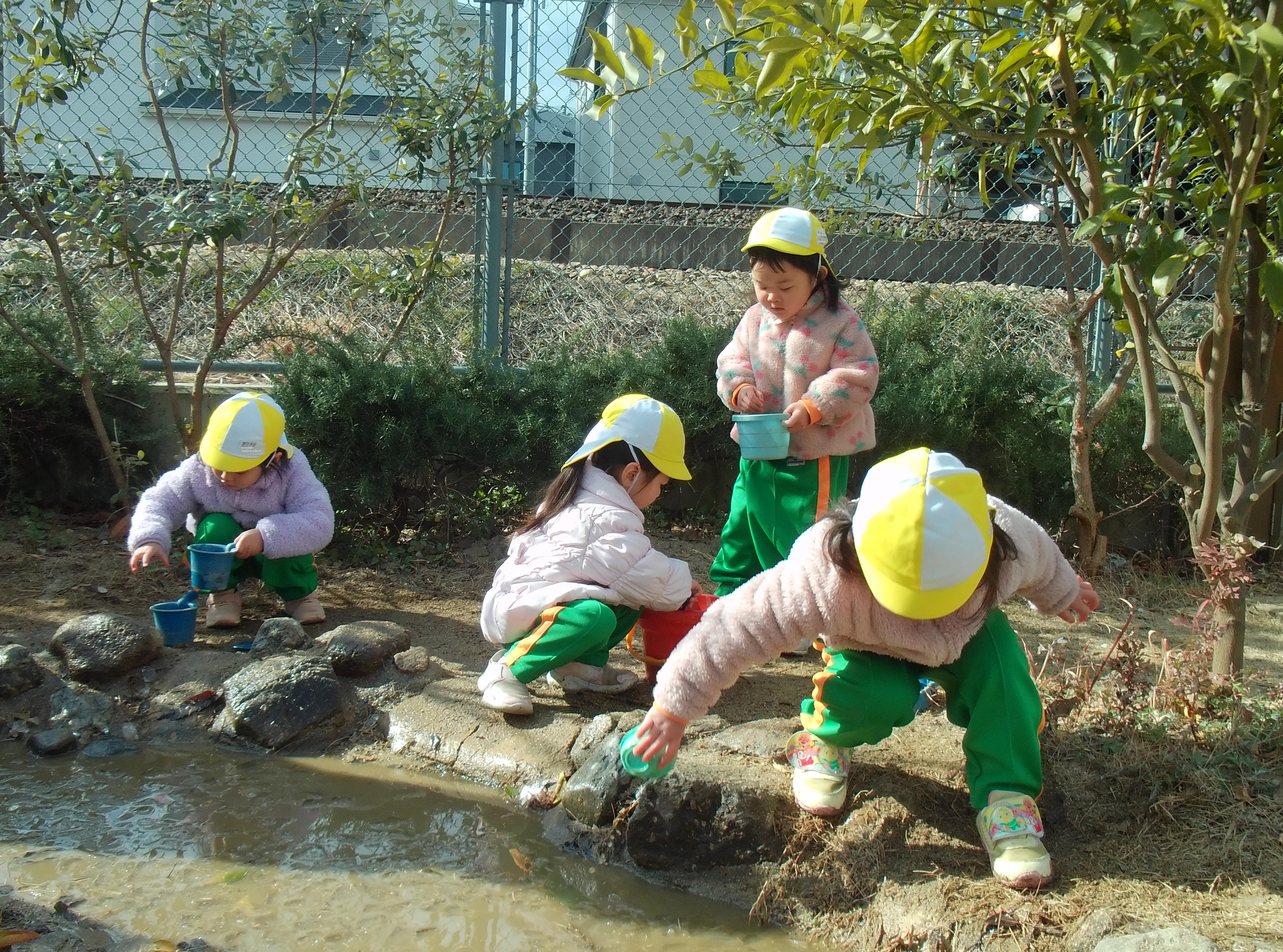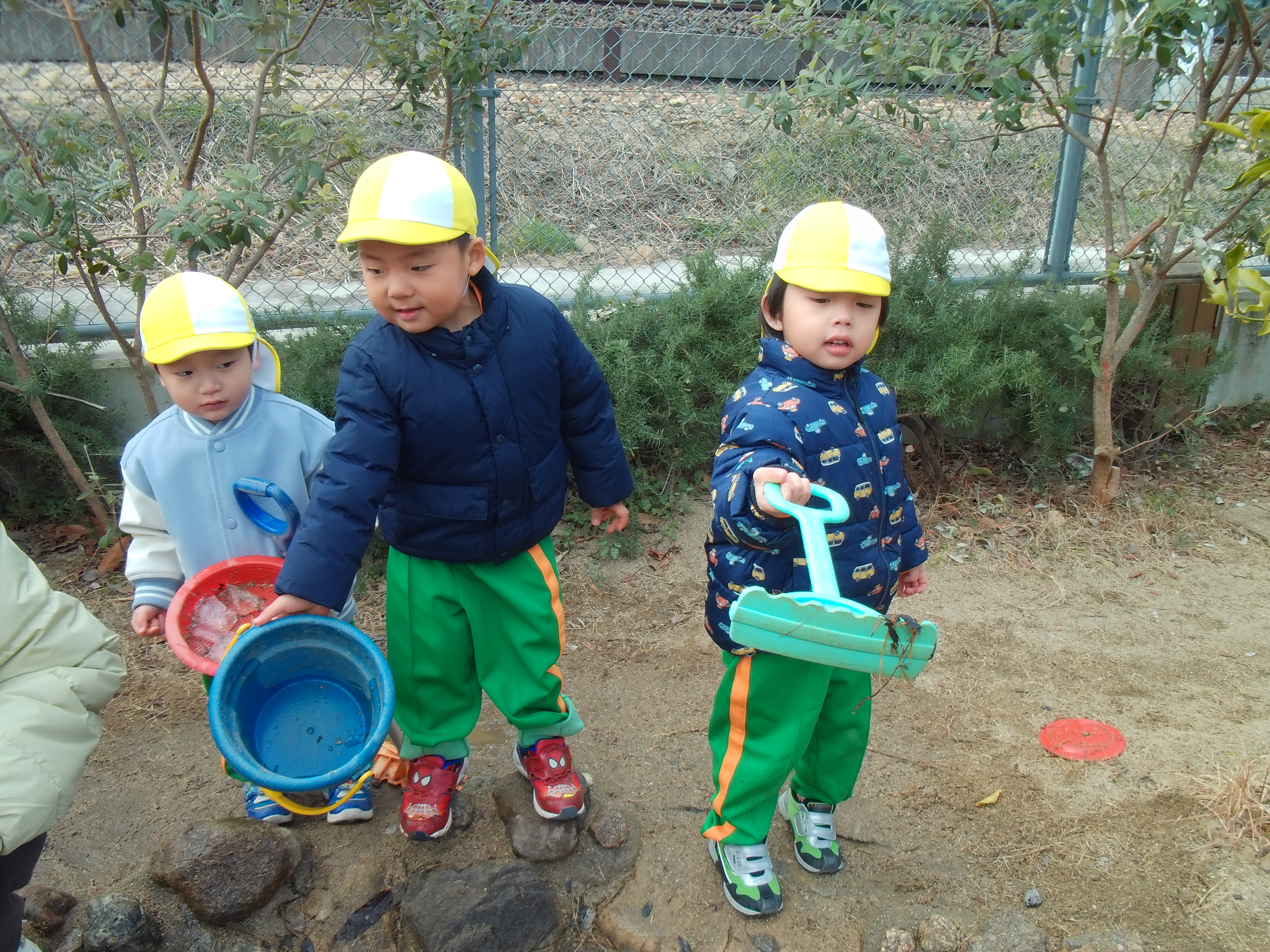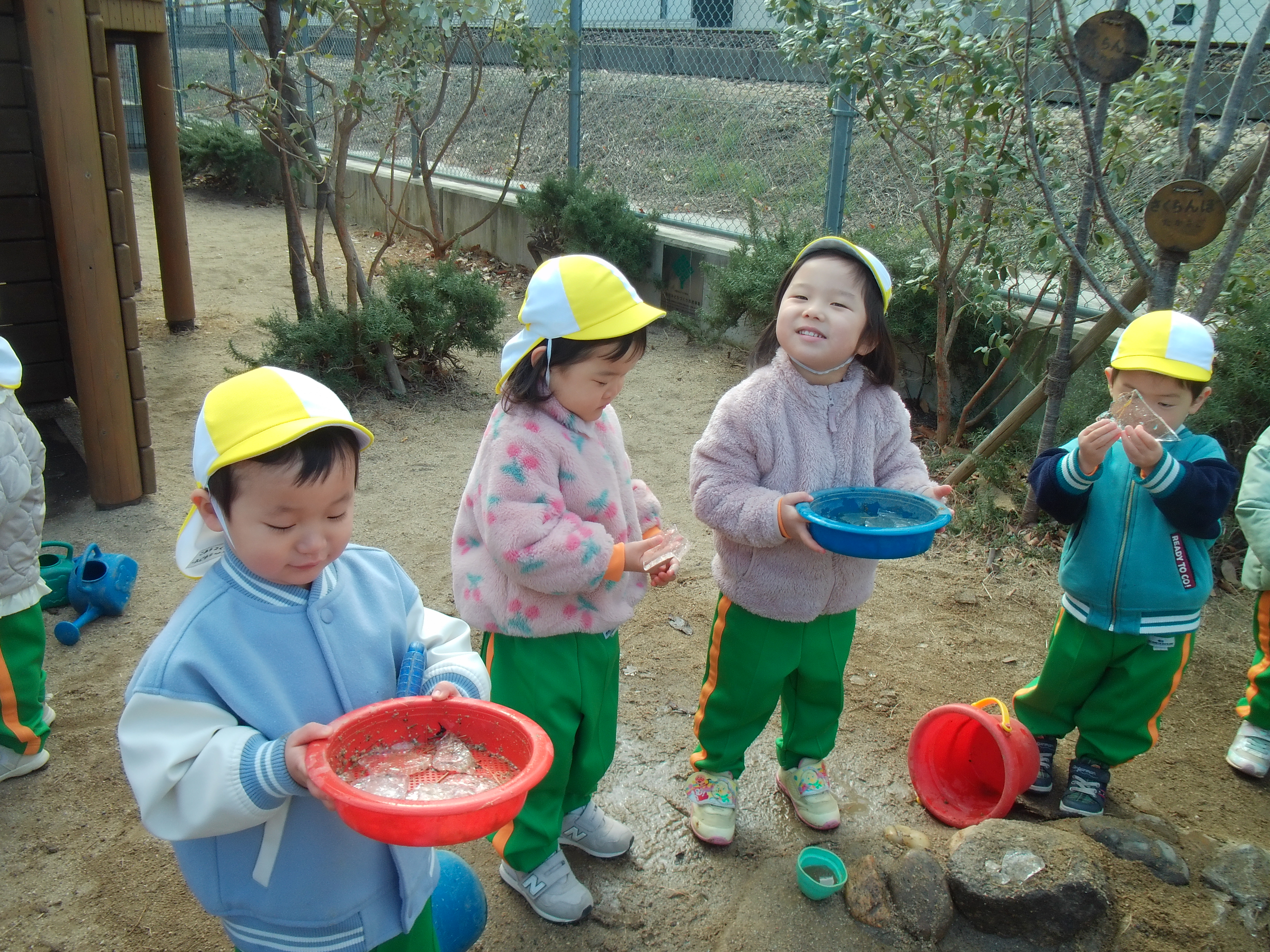 「きゃ~!」「いっぱい氷ある!」と大興奮の子ども達!とっても寒い中、氷を手で掴んで「みて~!」「おっきいのあった~!」と嬉しそうに見せてくれました♪