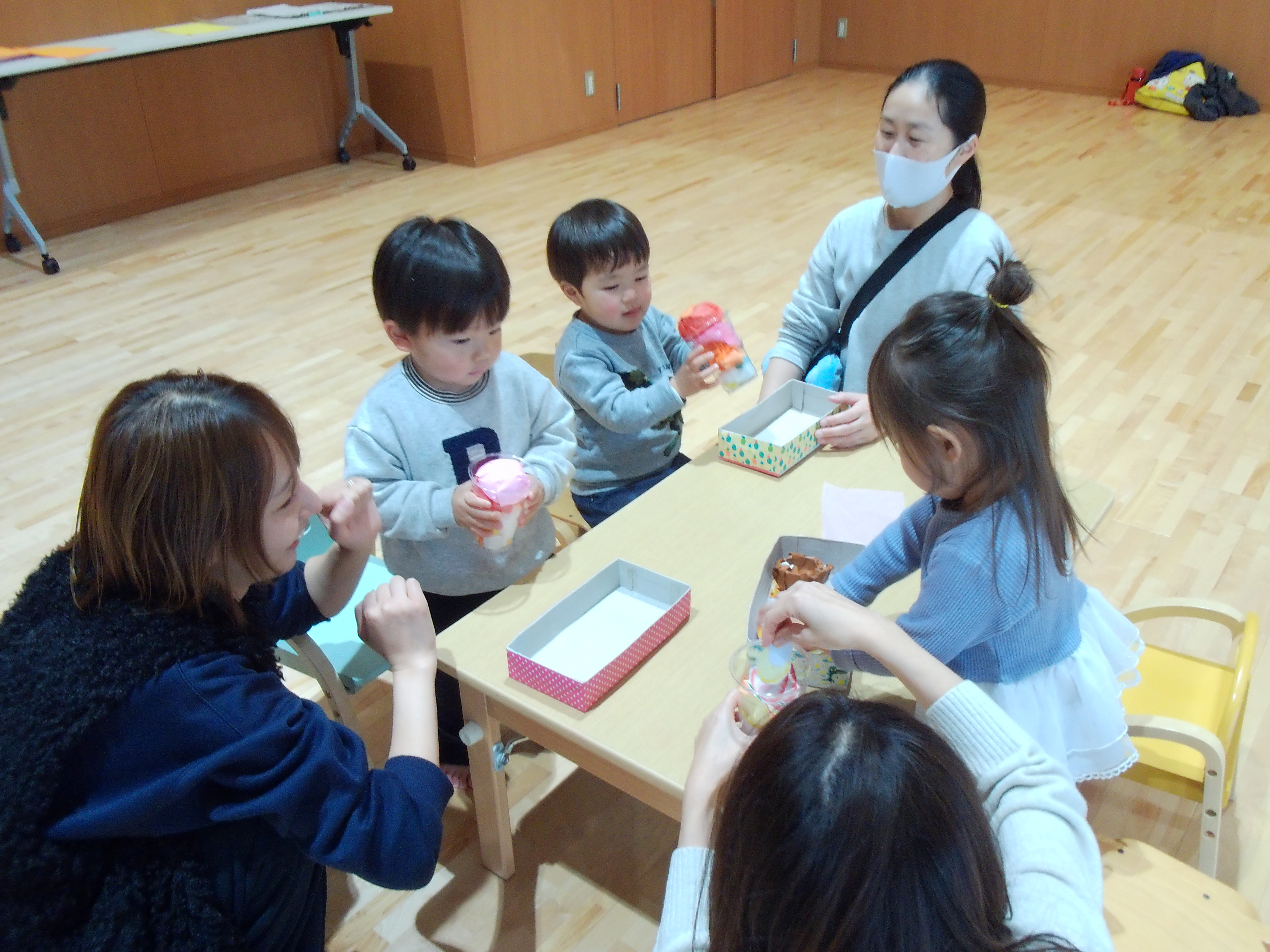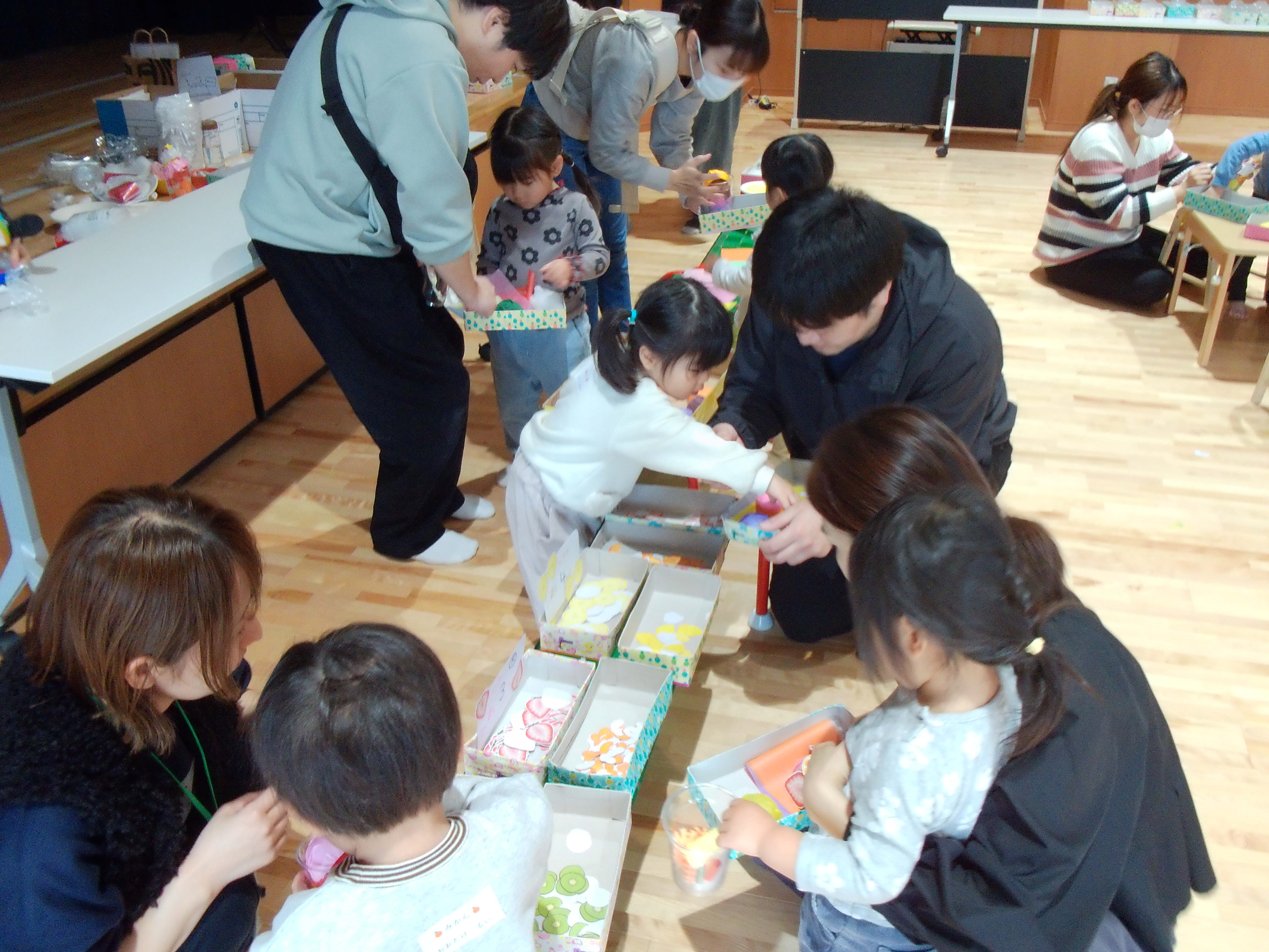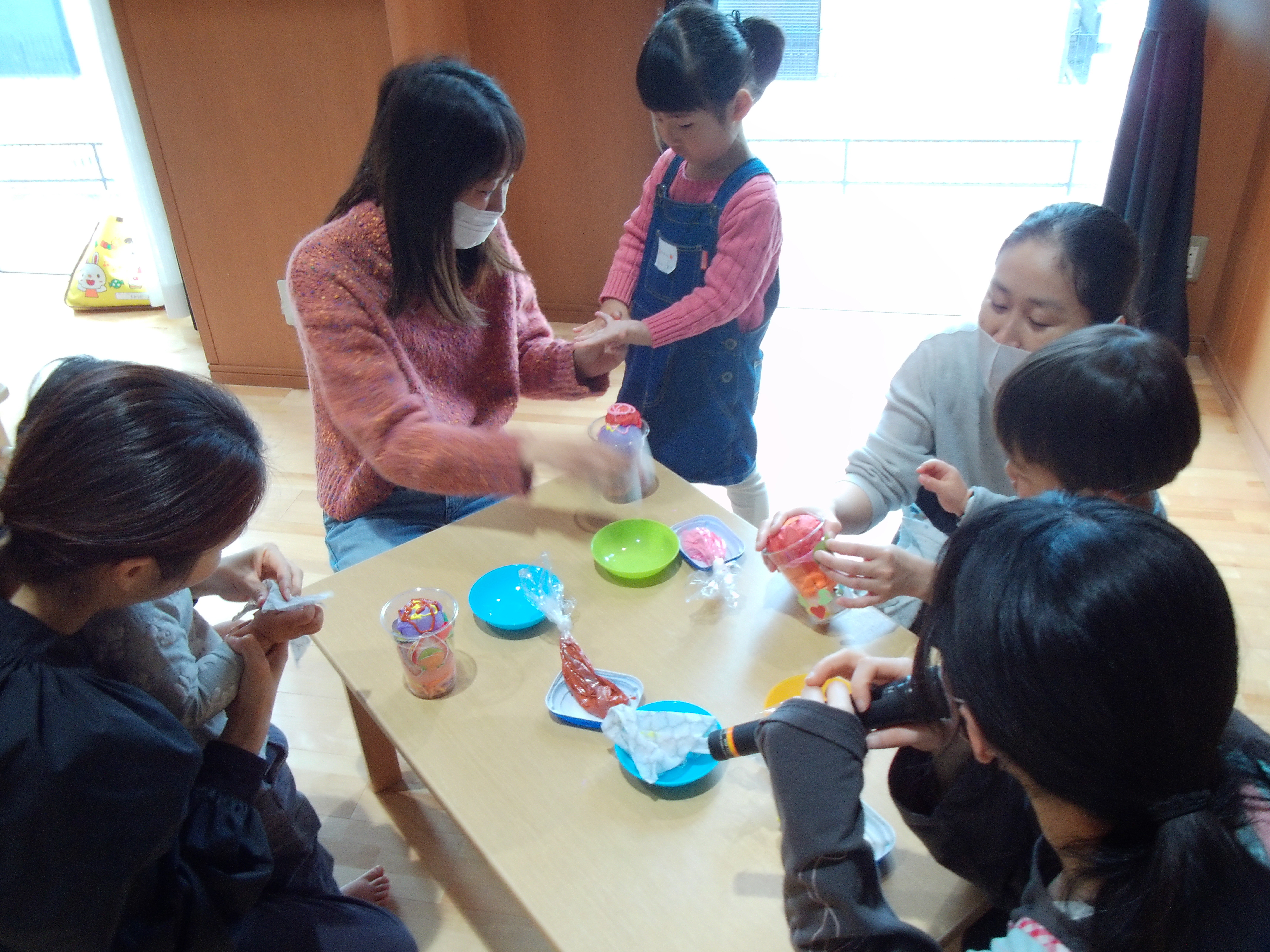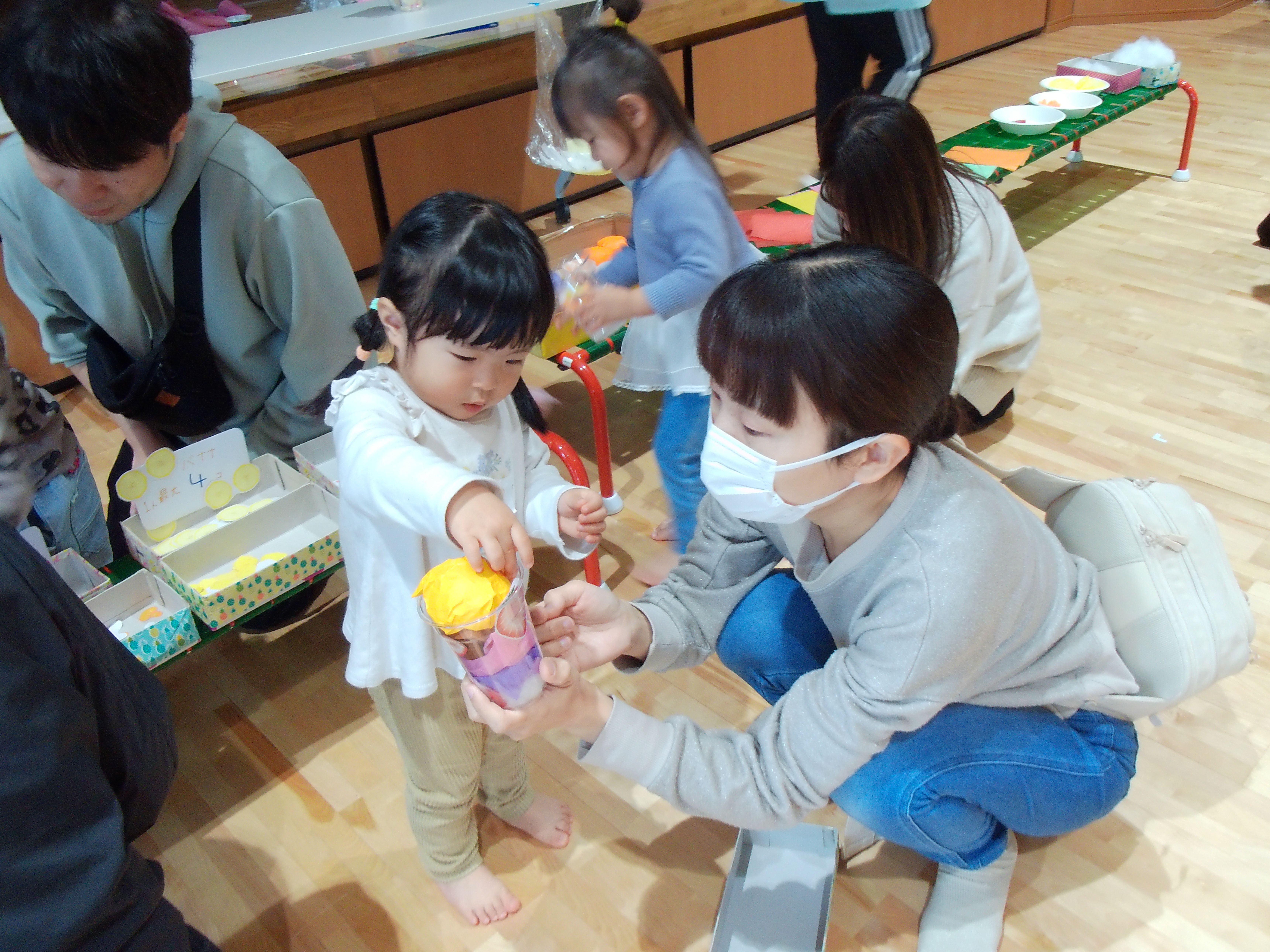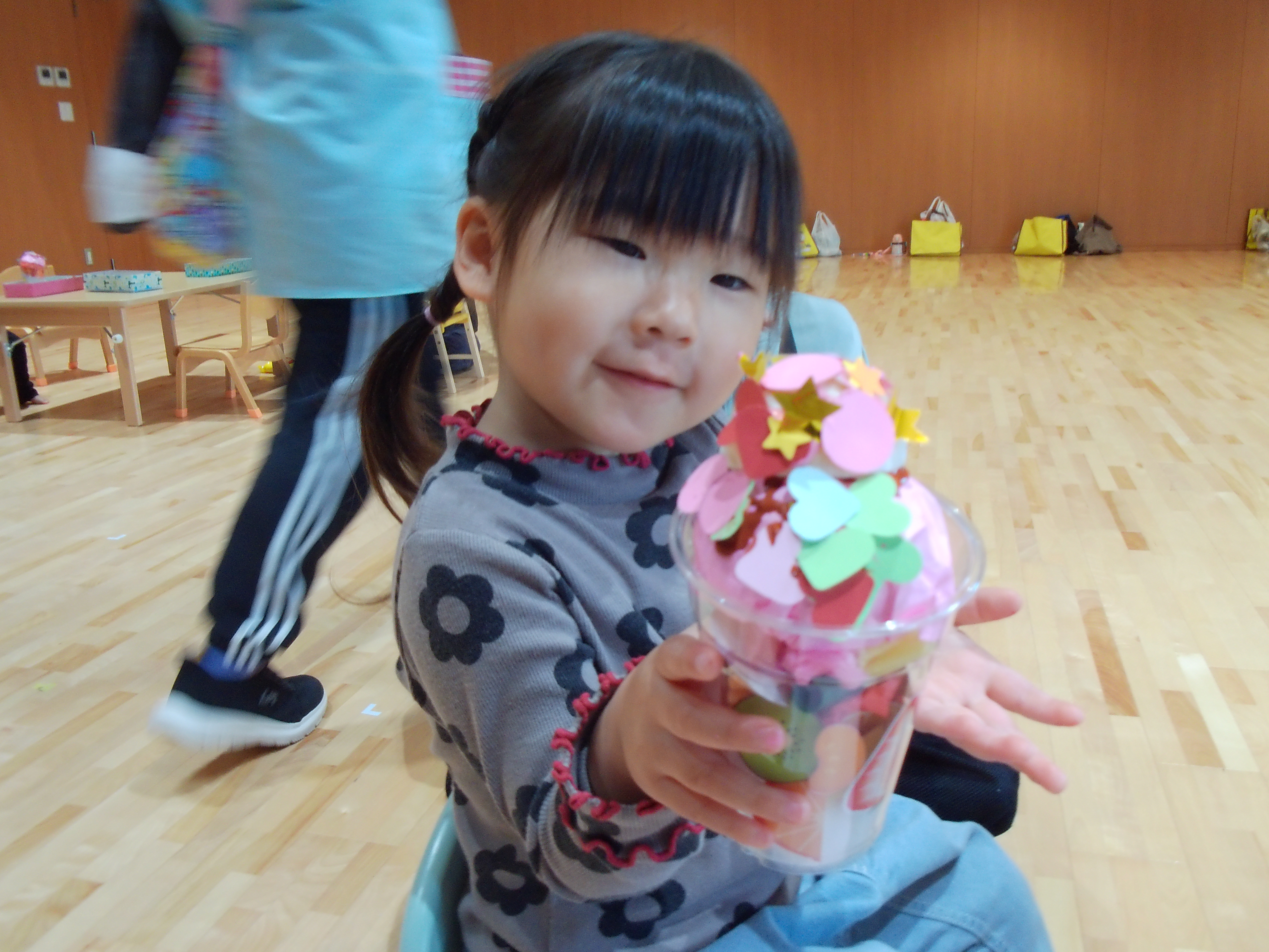 今日のすまいるランド2部はいろんな廃材を使ってオリジナルパフェ作りをしました♪様々な素材に目をキラキラさせながら選ぶ子どもたち!フルーツをいれたりソースをかけたりしておいしそうなパフェが完成しましたよ☆