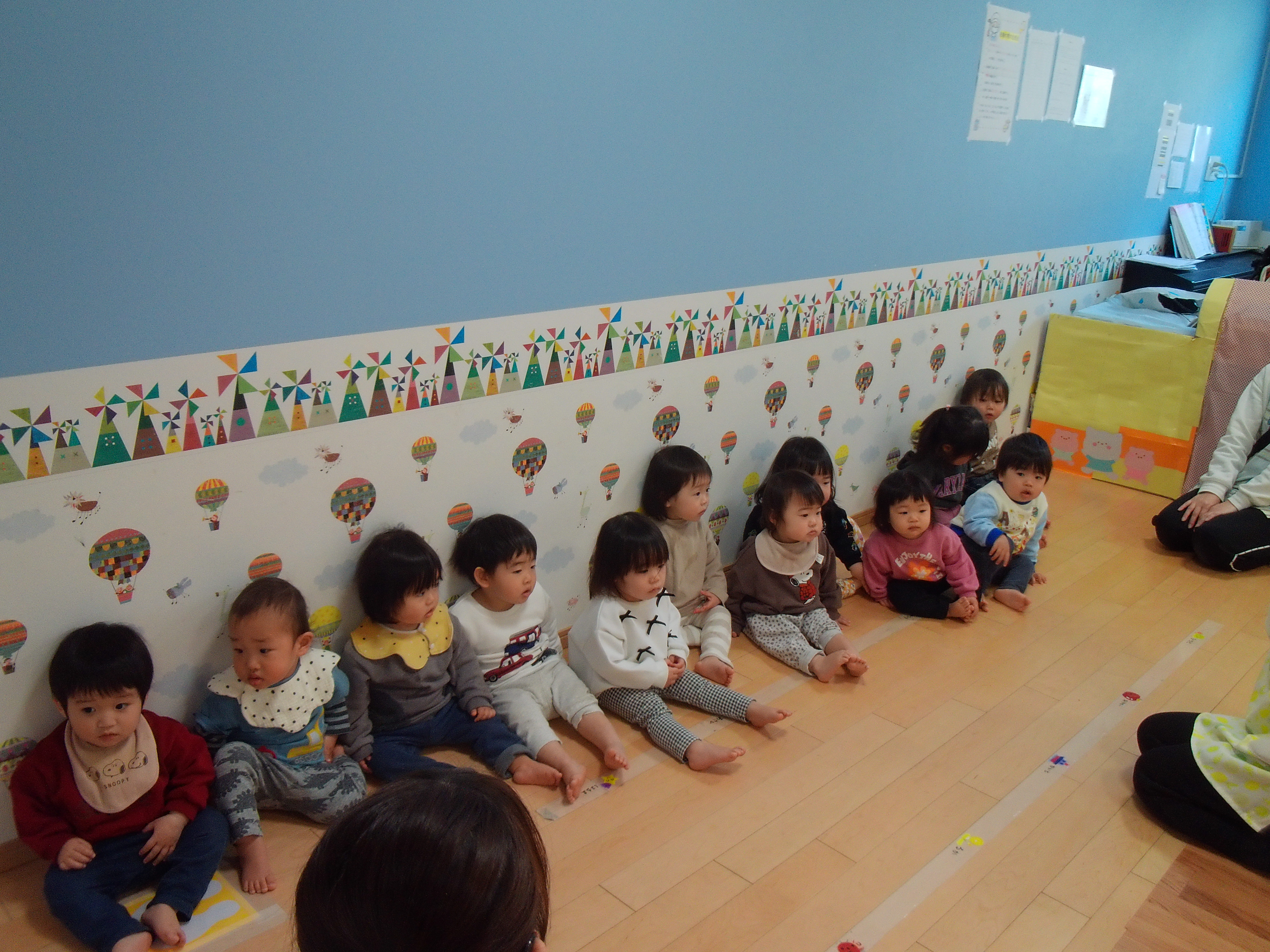 今日はあひる組さんのお部屋に遊びに行った時の様と以前行ったセンサリーマット遊びの様子をお届けします!!あひる組さんのお部屋に入ると、いつもと違うお部屋と玩具に興味津々のひよこ組さん!かっこよくお壁ぺったんで先生のお話を聞くことができました☆センサリーマット遊びでは、様々な感触のマットを見て不思議そうに見つめるひよこ組さん!ゆっくりゆっくりマットを踏んでみたり、、、♡「わぁー!!」と大喜びでしたよ♡