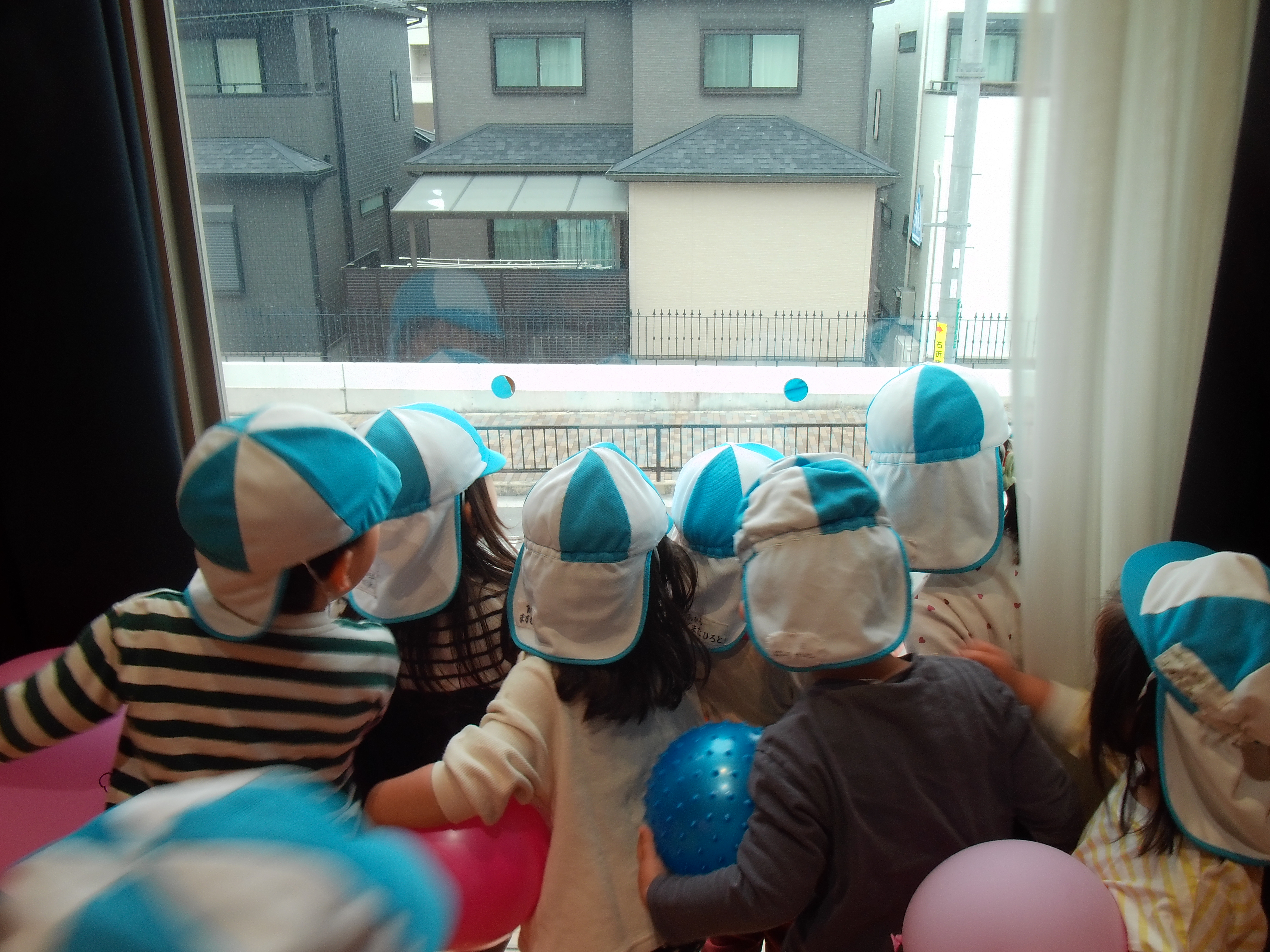 お友だちと一緒にボールを投げたりお遊戯室から見えるお外を見て「わー!郵便車!」「電車きたー!」と楽しそうにお話していましたよ♪