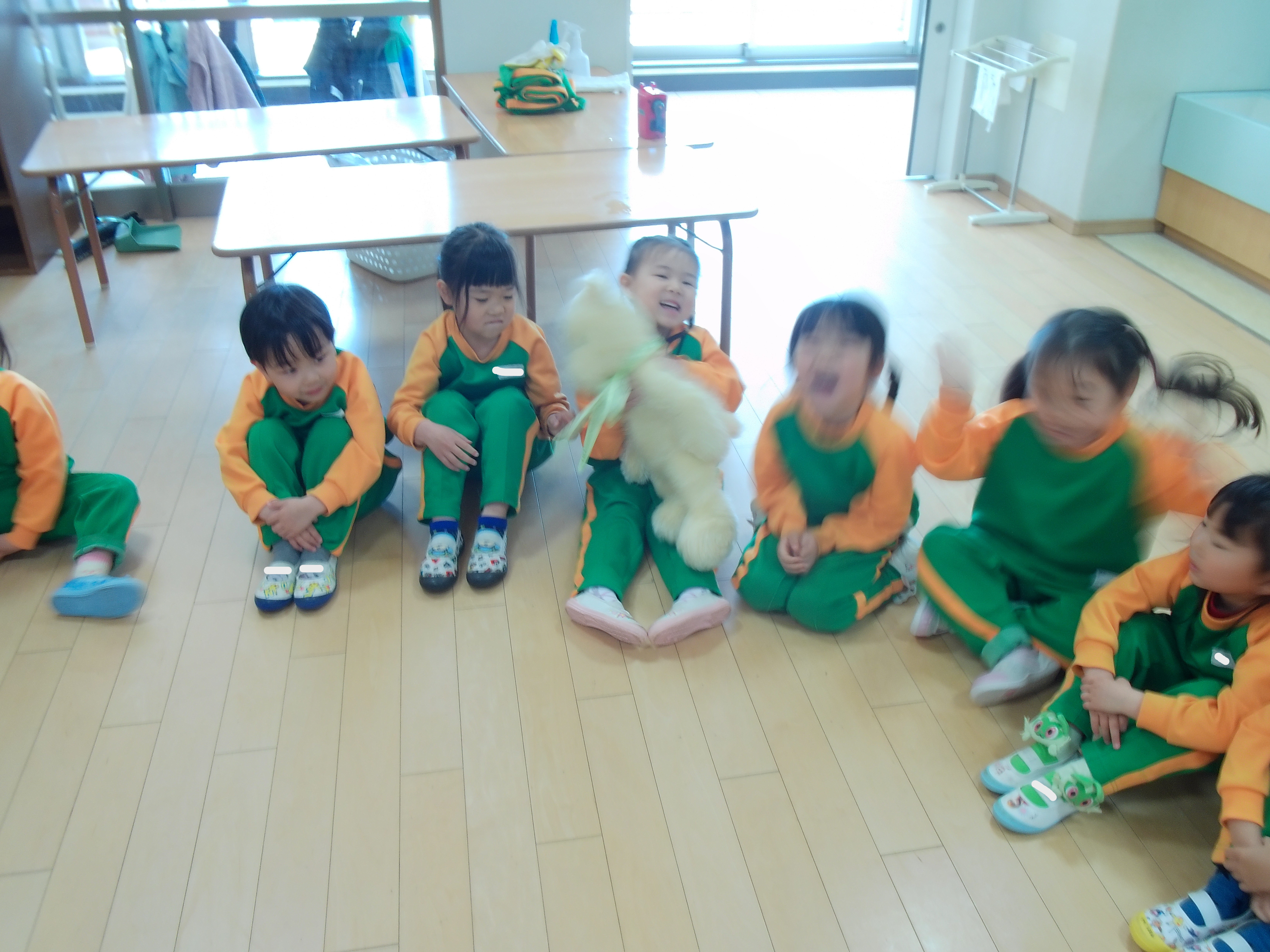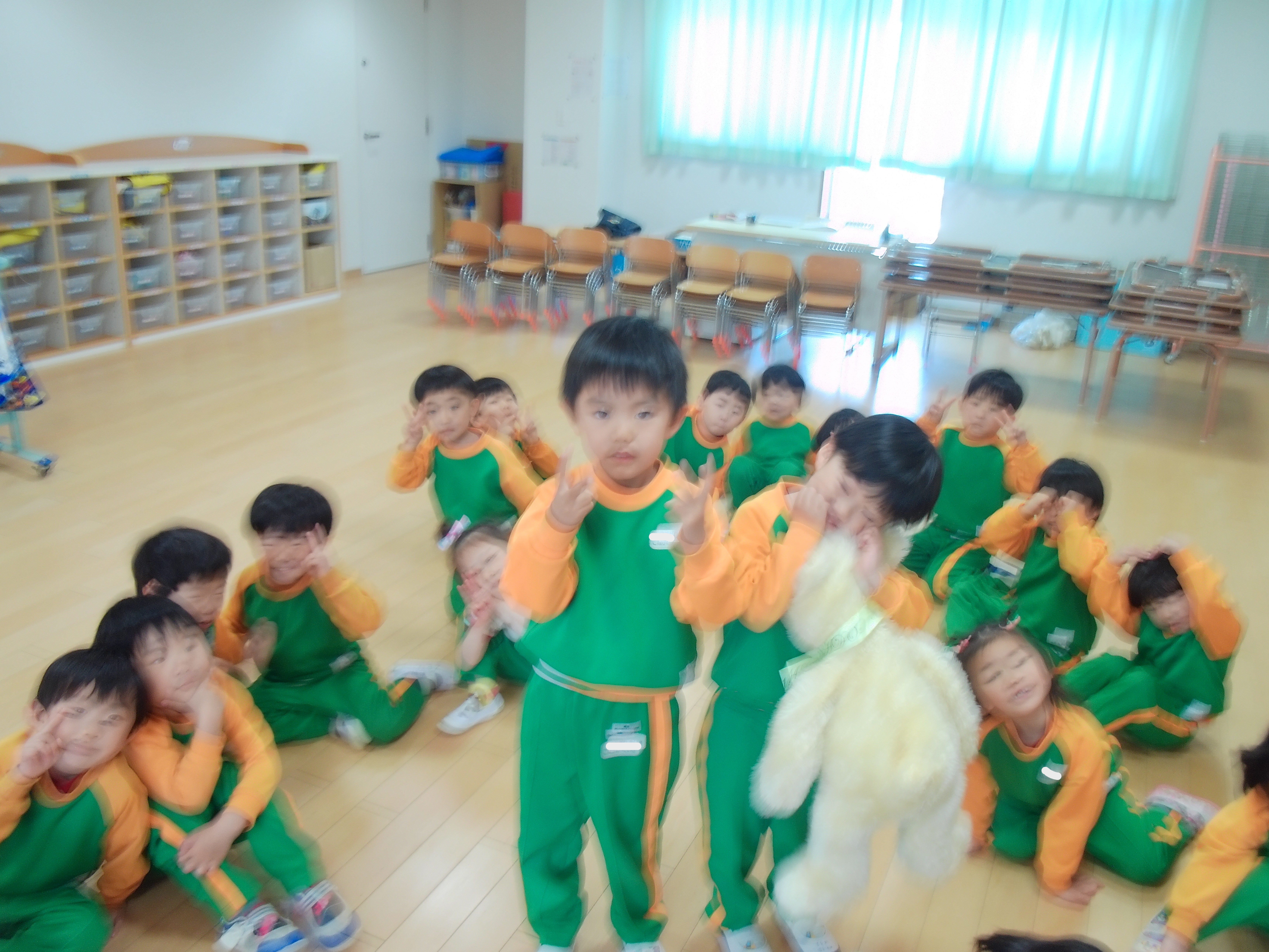 今日は、爆弾ゲームを行いました☆お友達の発表を真剣に聞くことが出来ていましたよ!急いで人形を隣のお友だちに回し、大盛り上がりでした☆