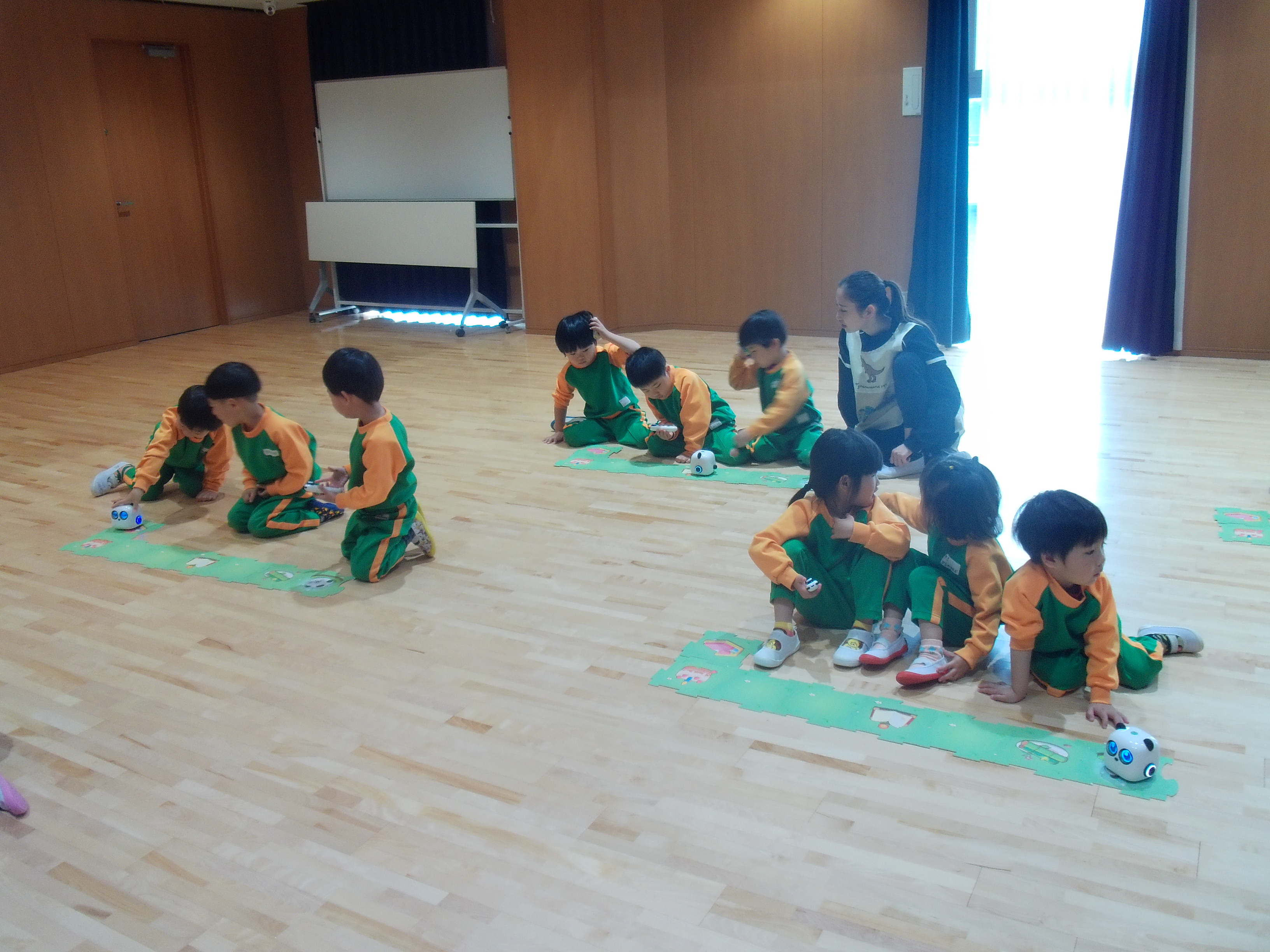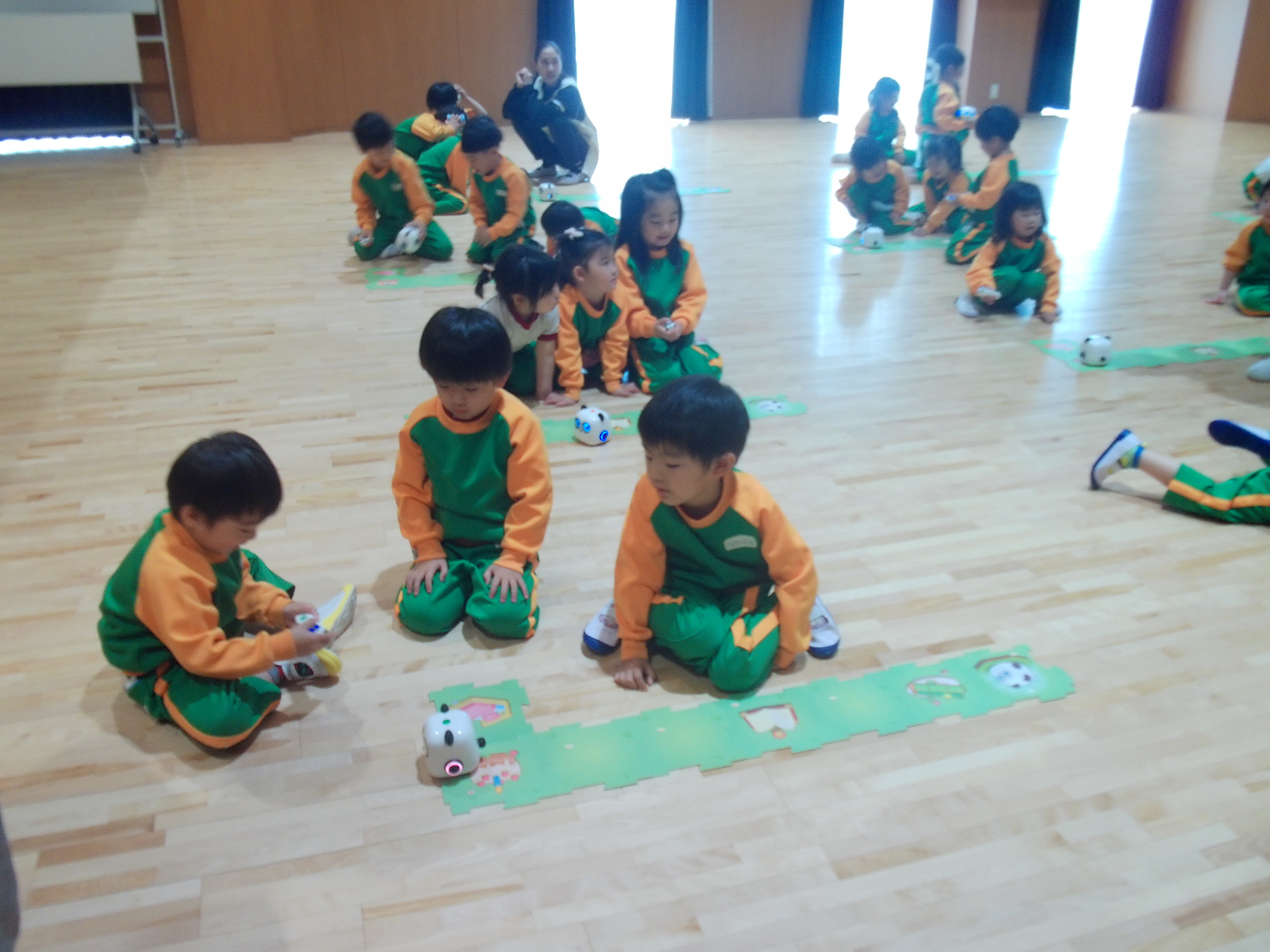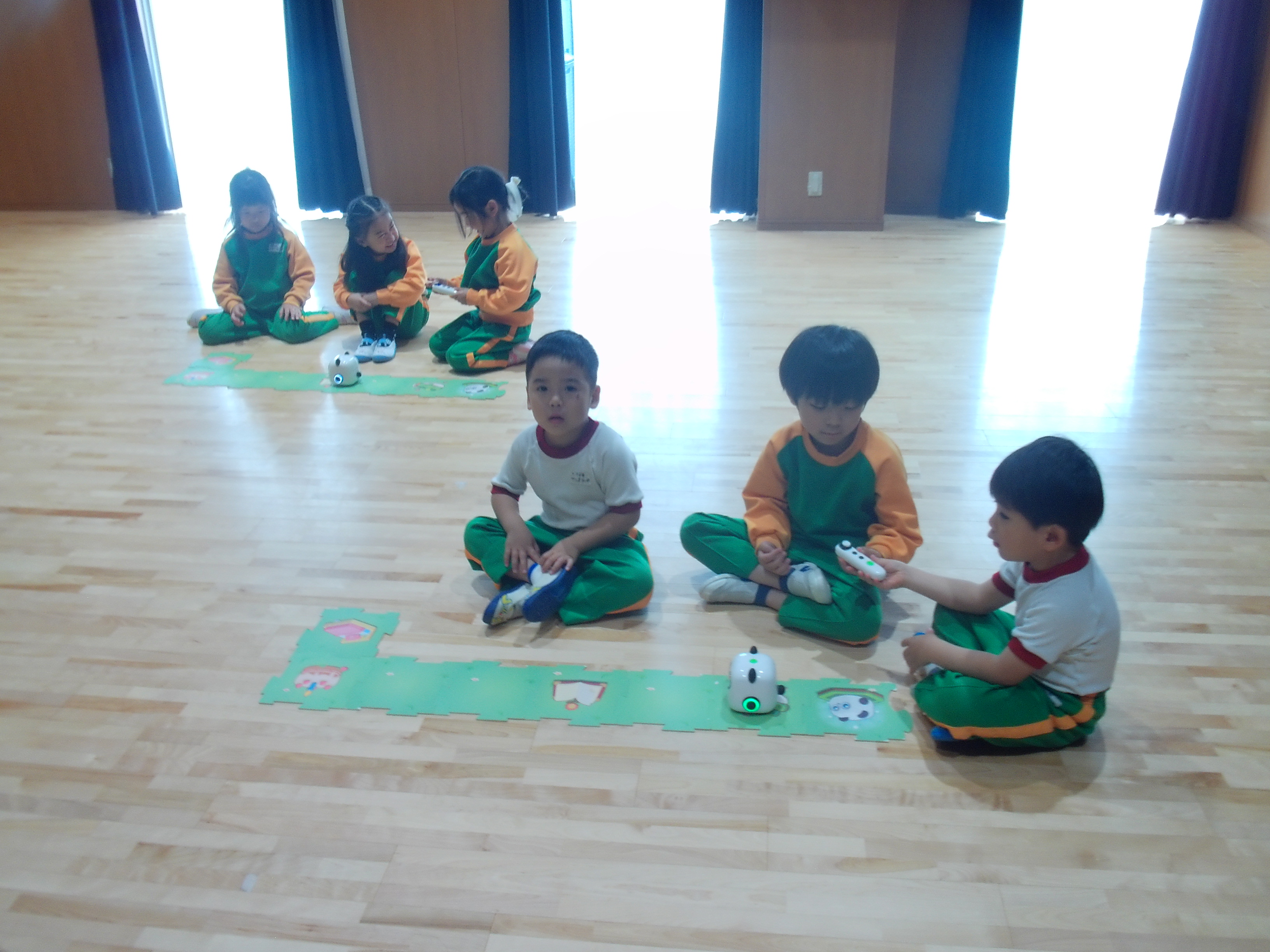 園長先生のお話を真剣に聞き、 自分たちで三人組に分かれて 「しらさぎちゃん」というロボットを動かしました!「おー!うごいたー!」や「すごっ!」と大はしゃぎの子ども達でした♡