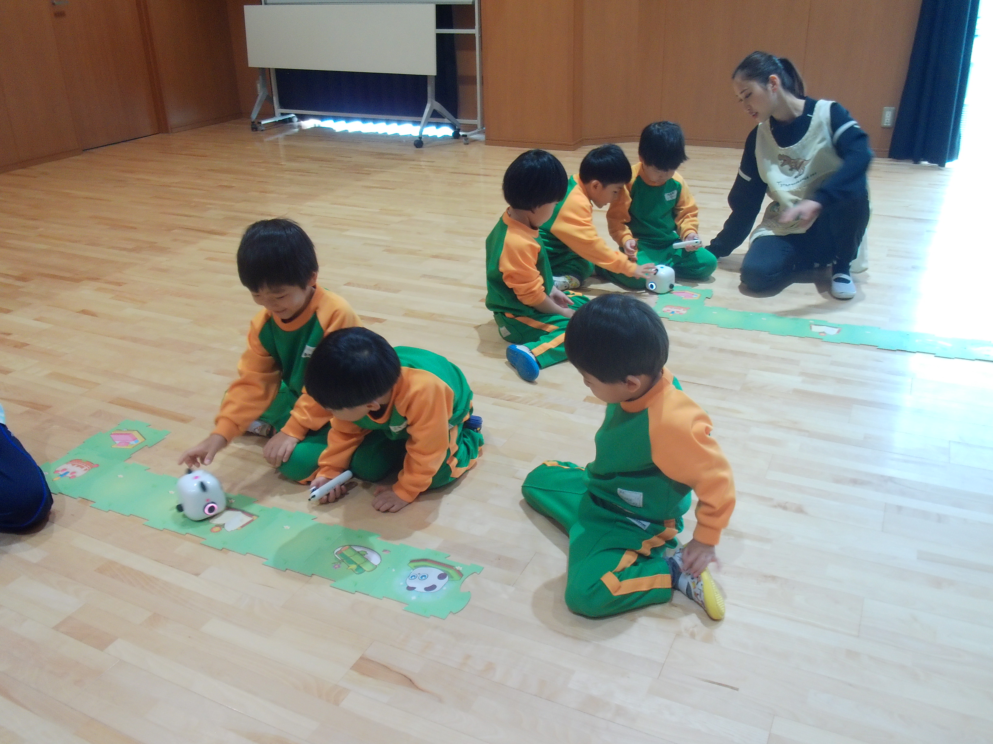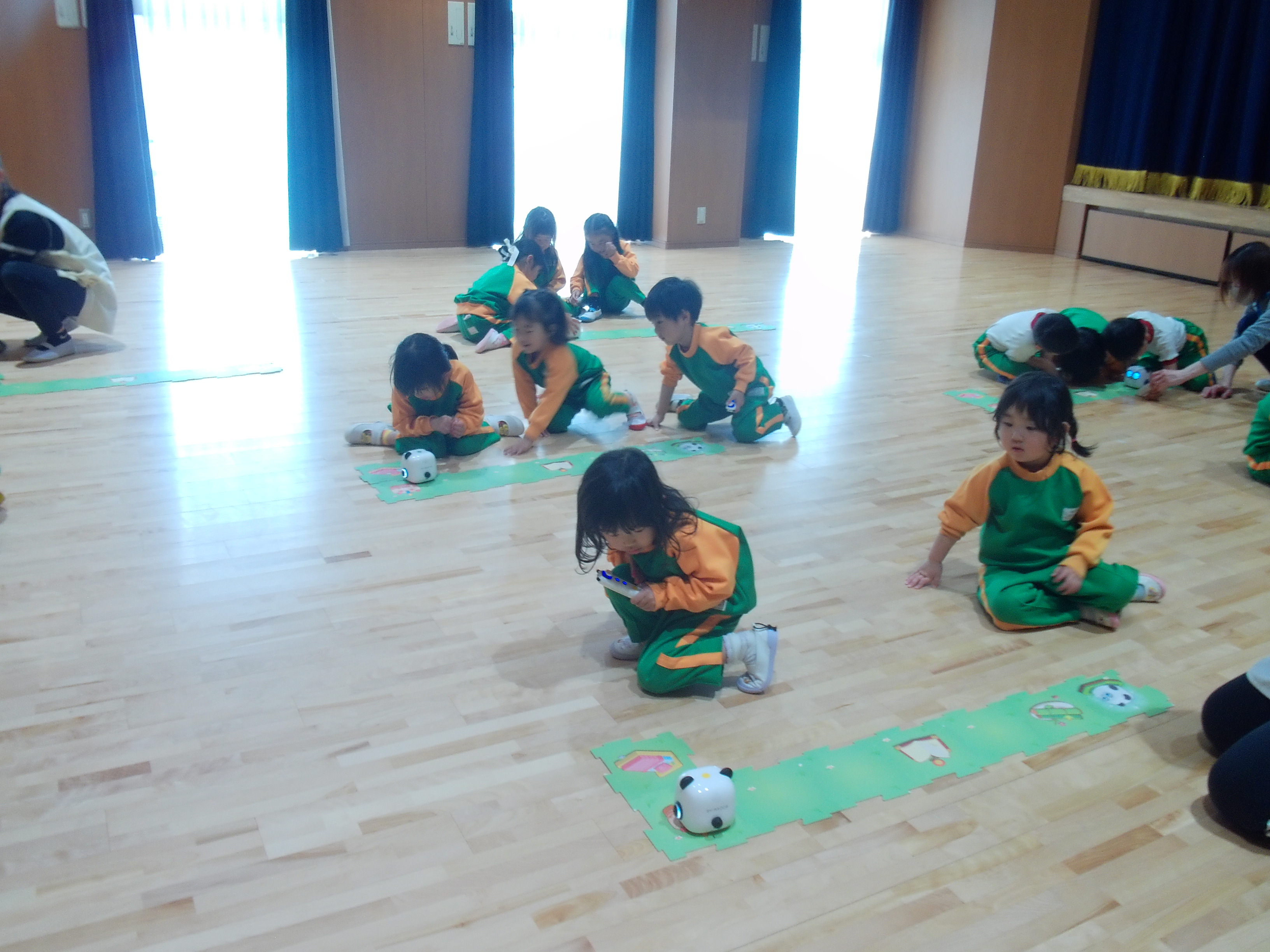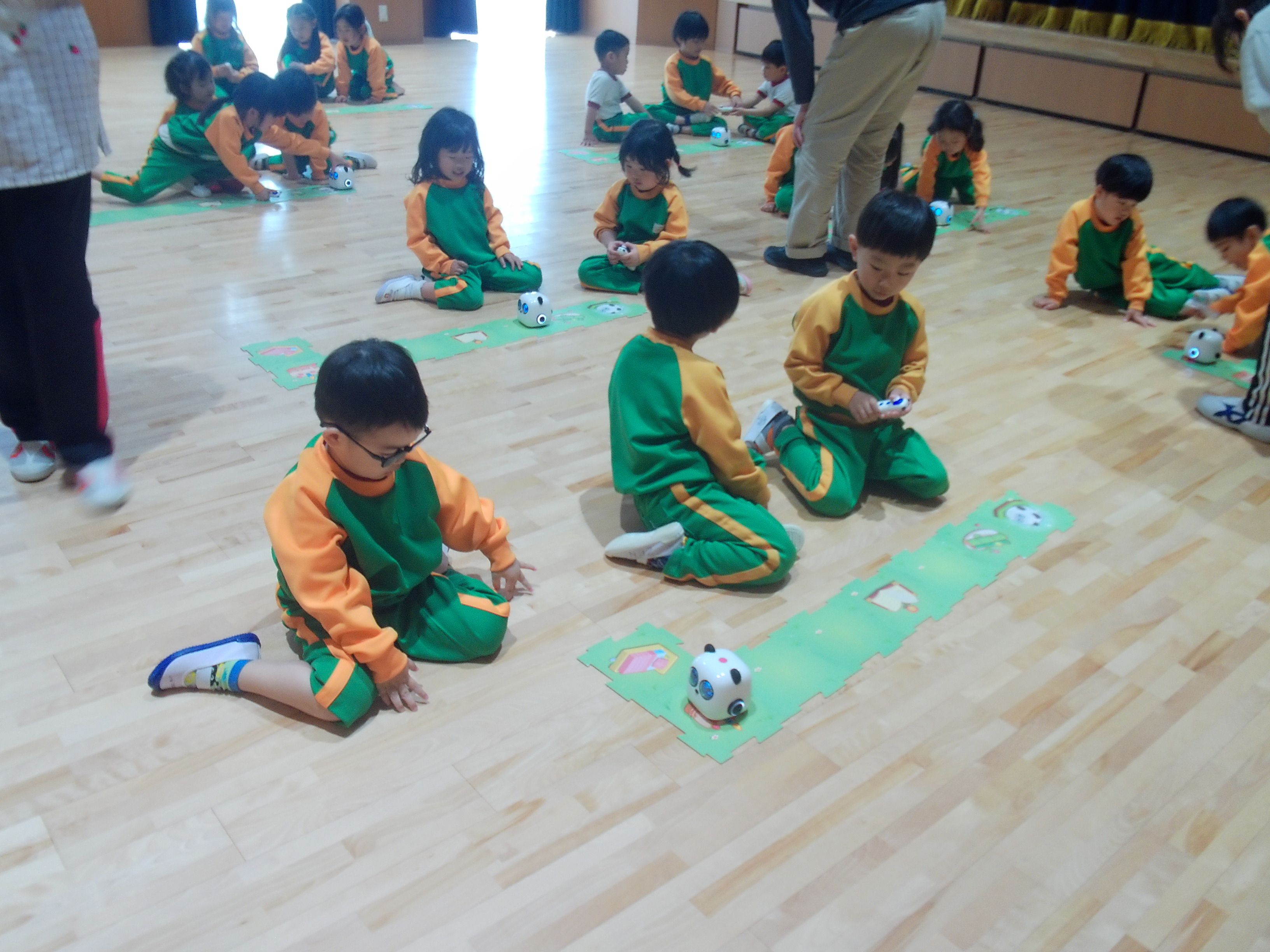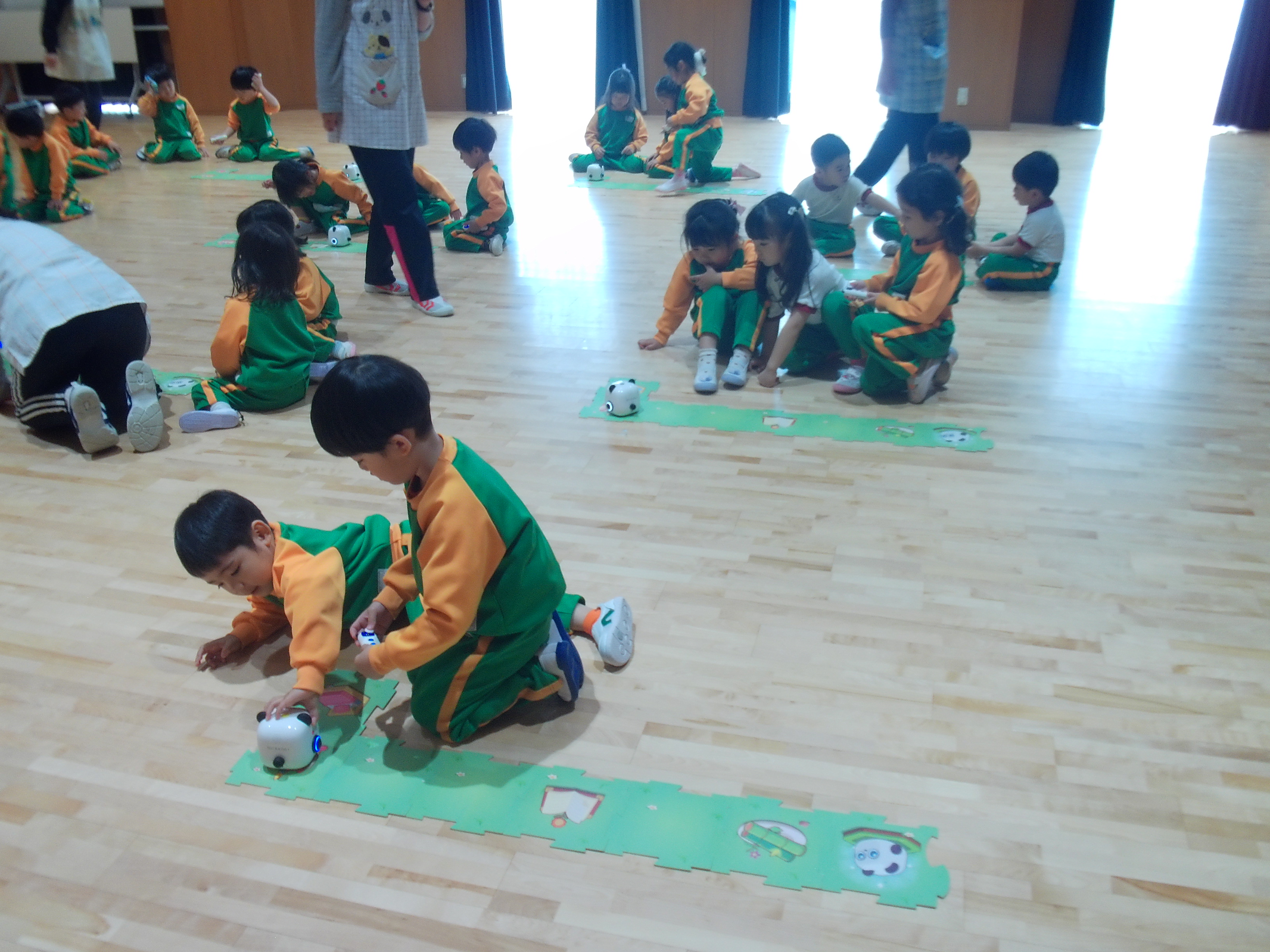園長先生のお話を真剣に聞き、 自分たちで三人組に分かれて 「しらさぎちゃん」というロボットを動かしました!「おー!うごいたー!」や「すごっ!」と大はしゃぎの子ども達でした♡