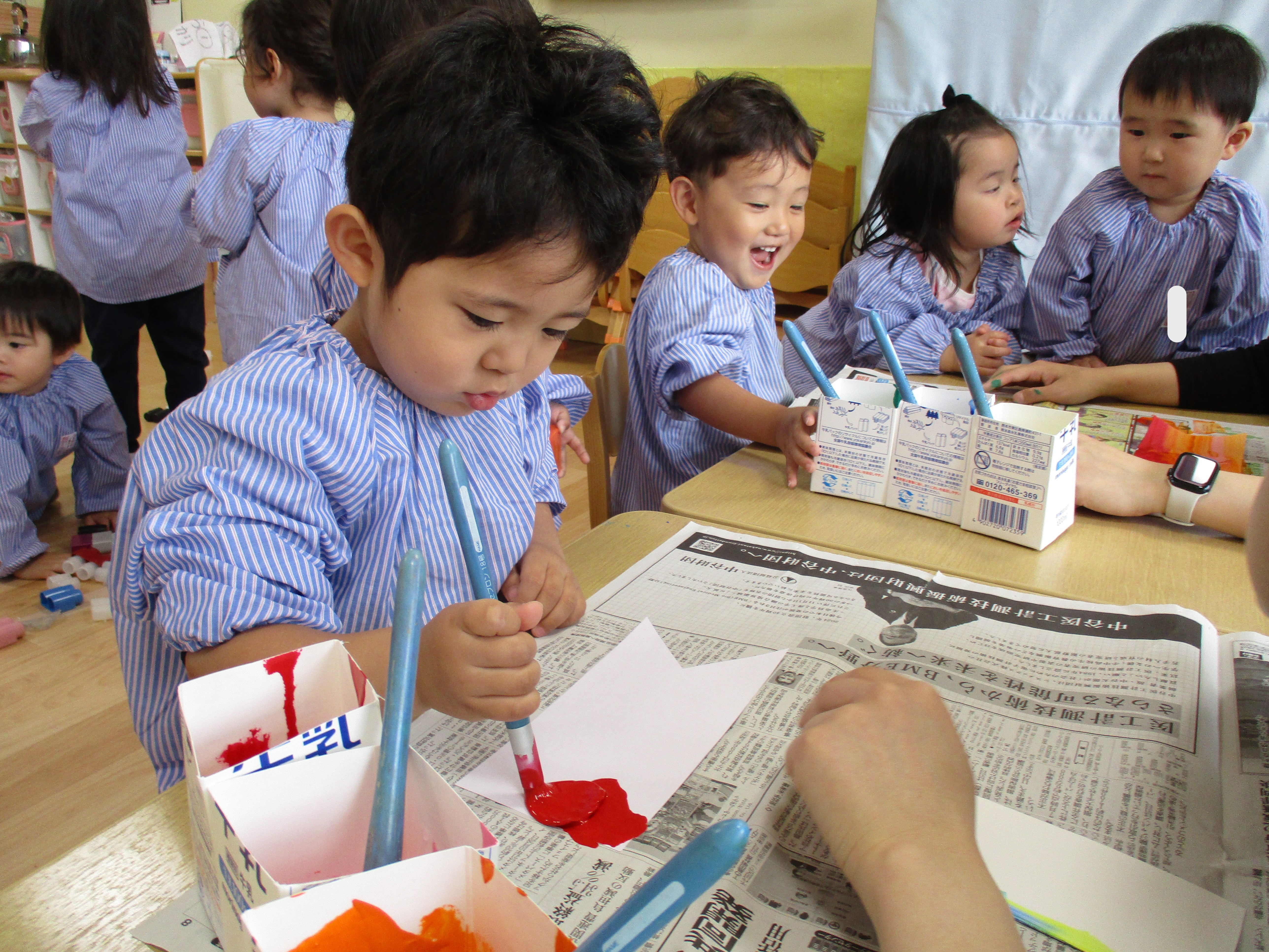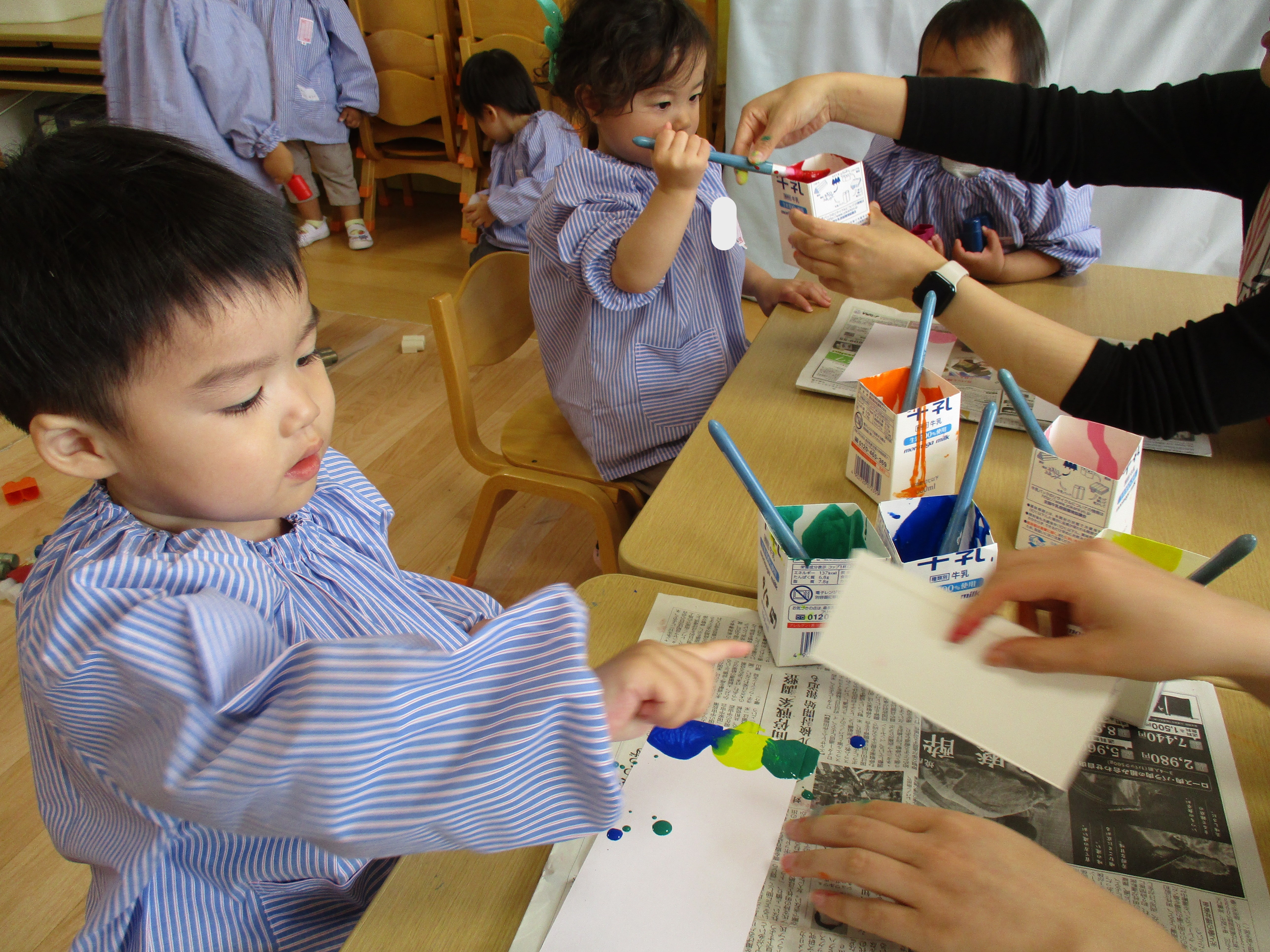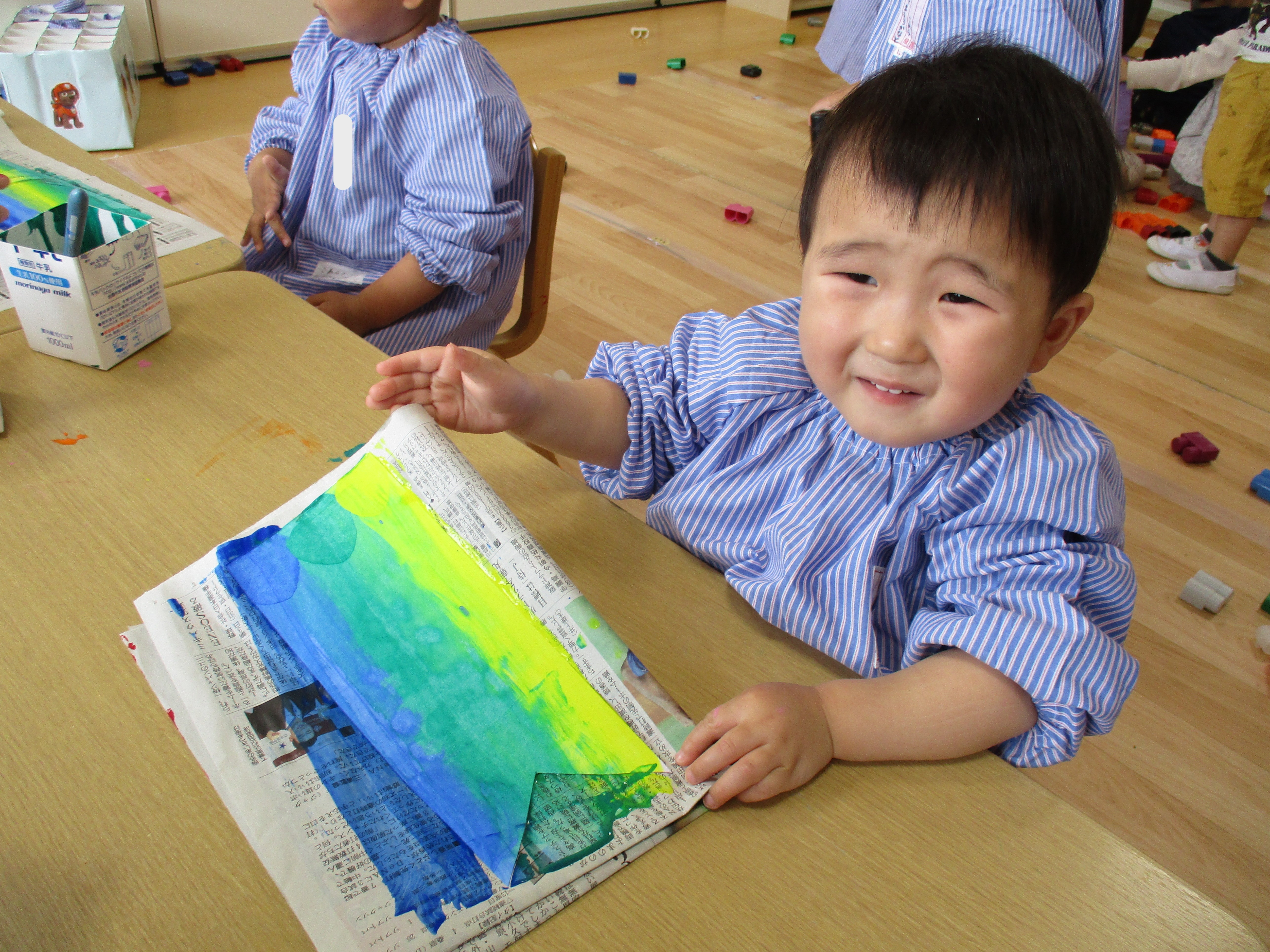 自分で色をのせてスワイプアートをしたのですが、色が広がっている様子を見て、「わあ!」「すごーい♡」と感動している子どもたちが可愛かったです♡