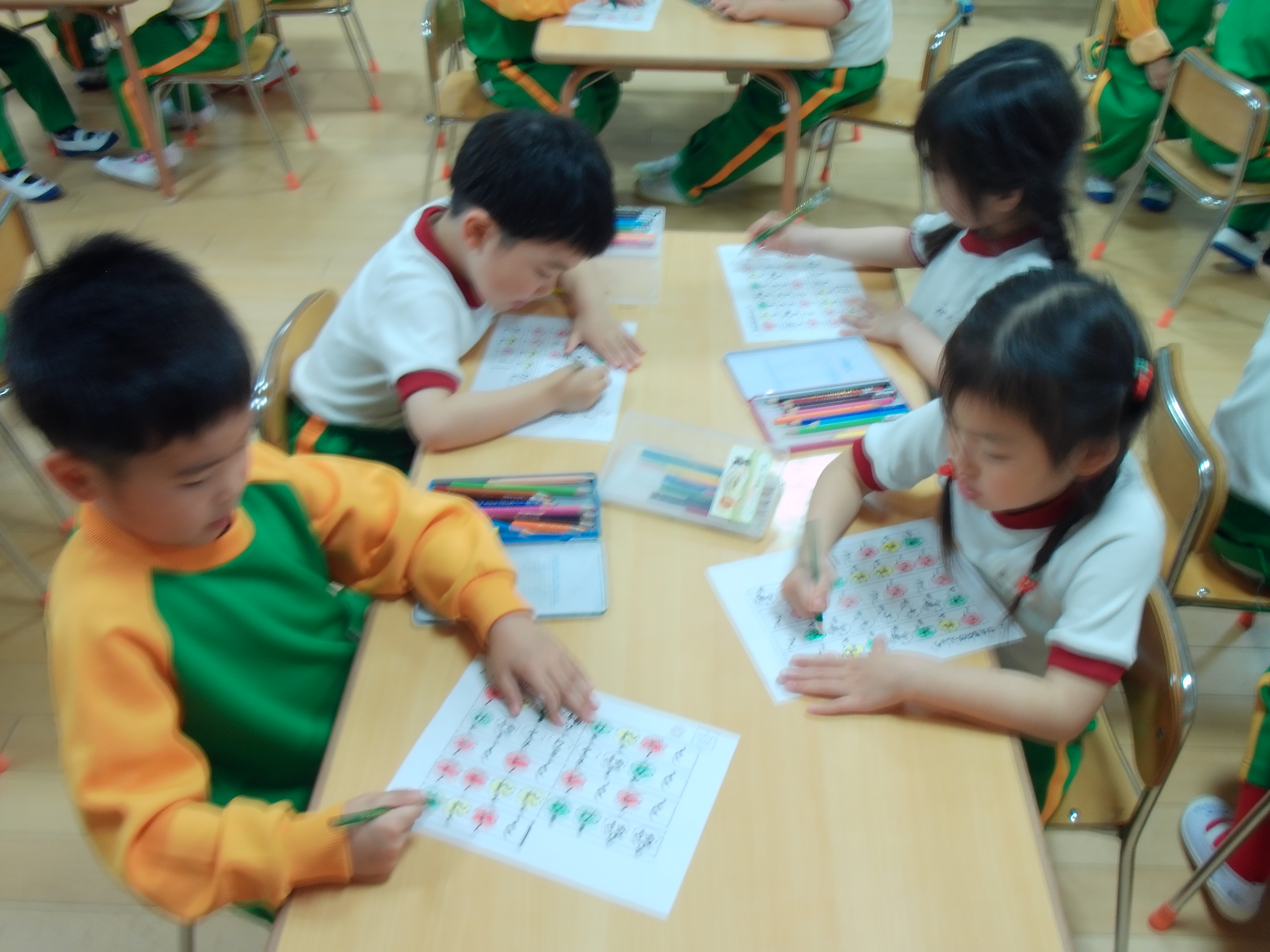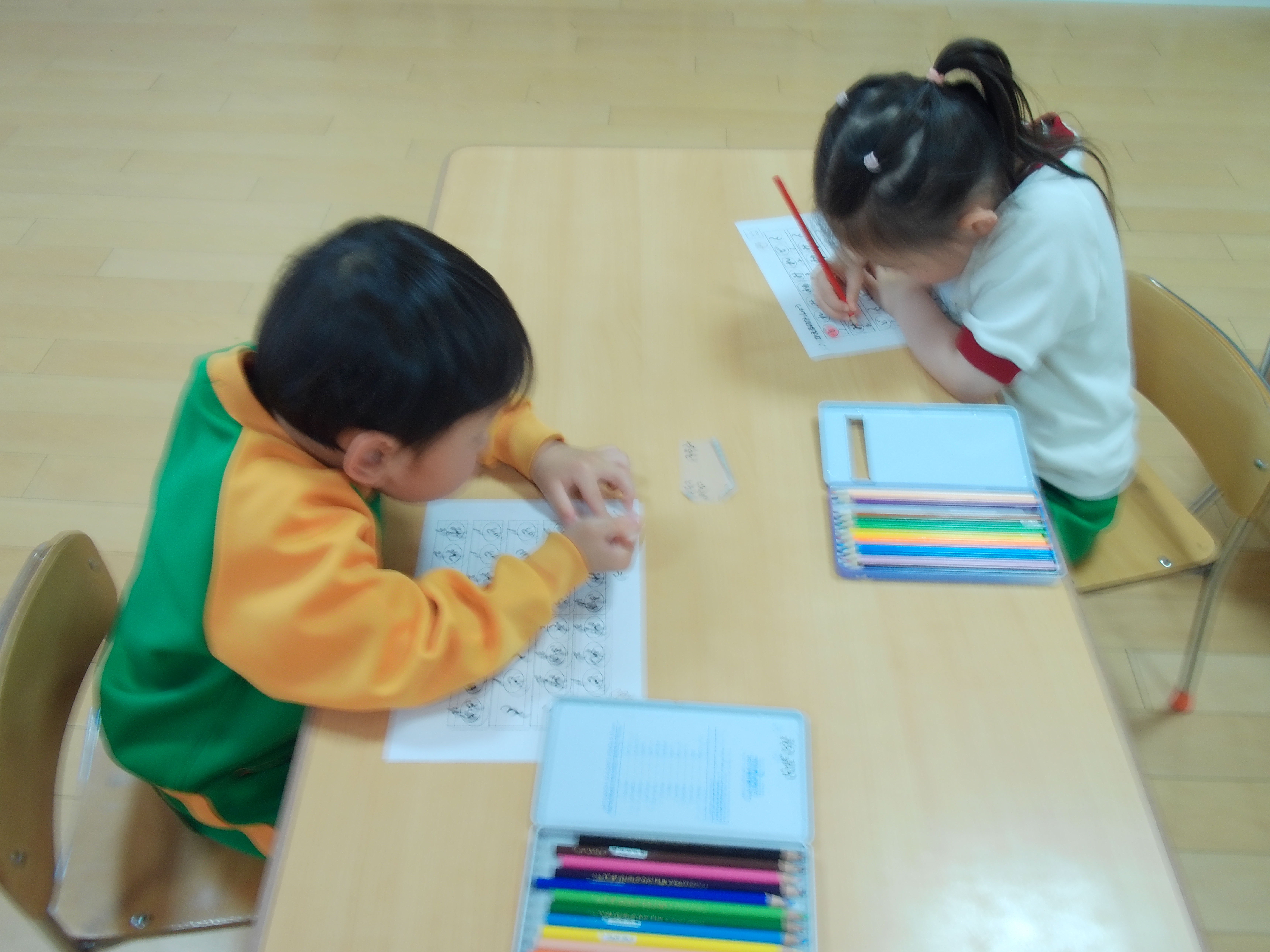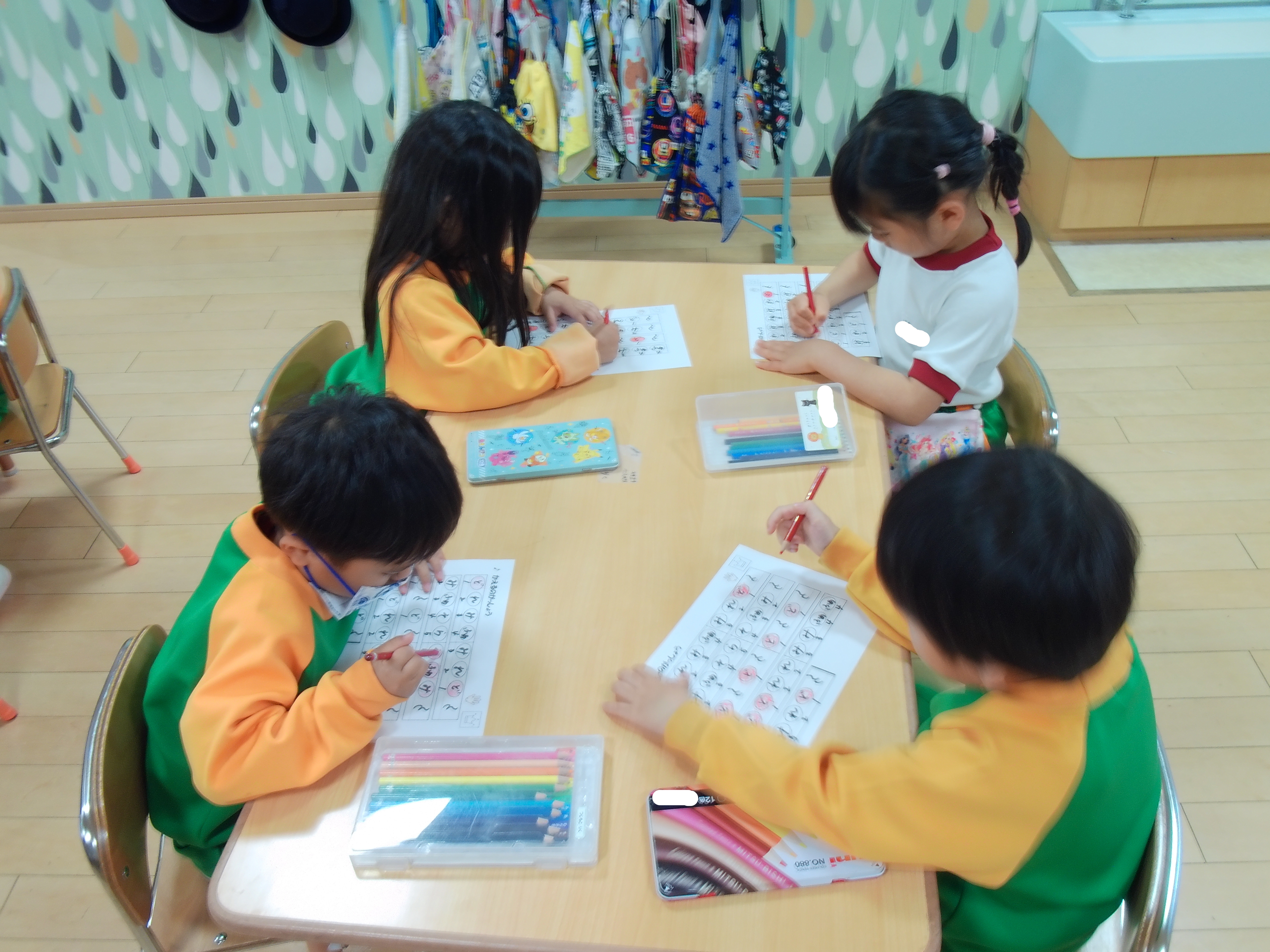 今日は、はじめてメロディオンの活動を行いました!「ど」は赤、「れ」は黄などの色を確認したあと、自分達で考えながら色を塗り 楽譜を完成させました☆