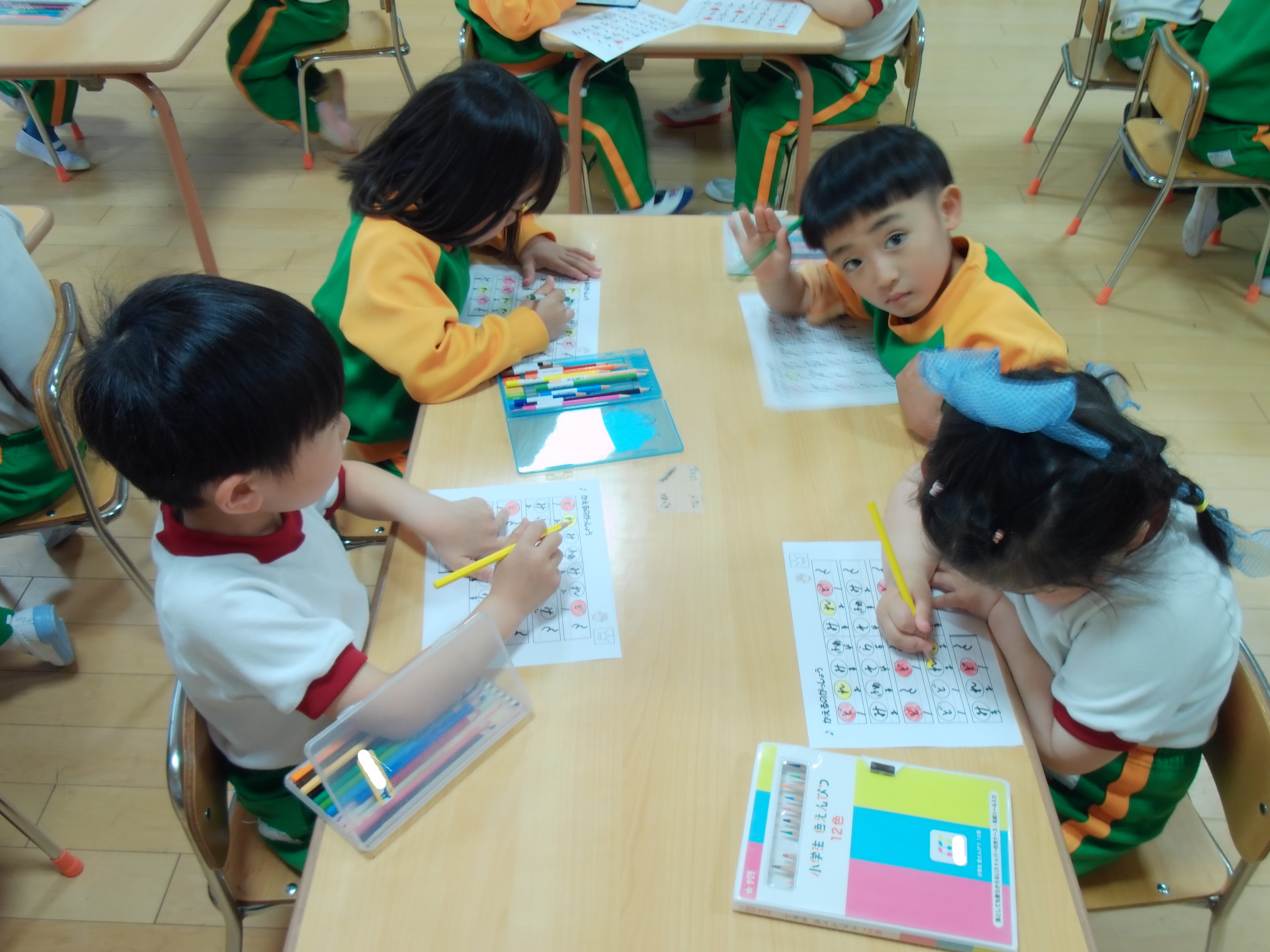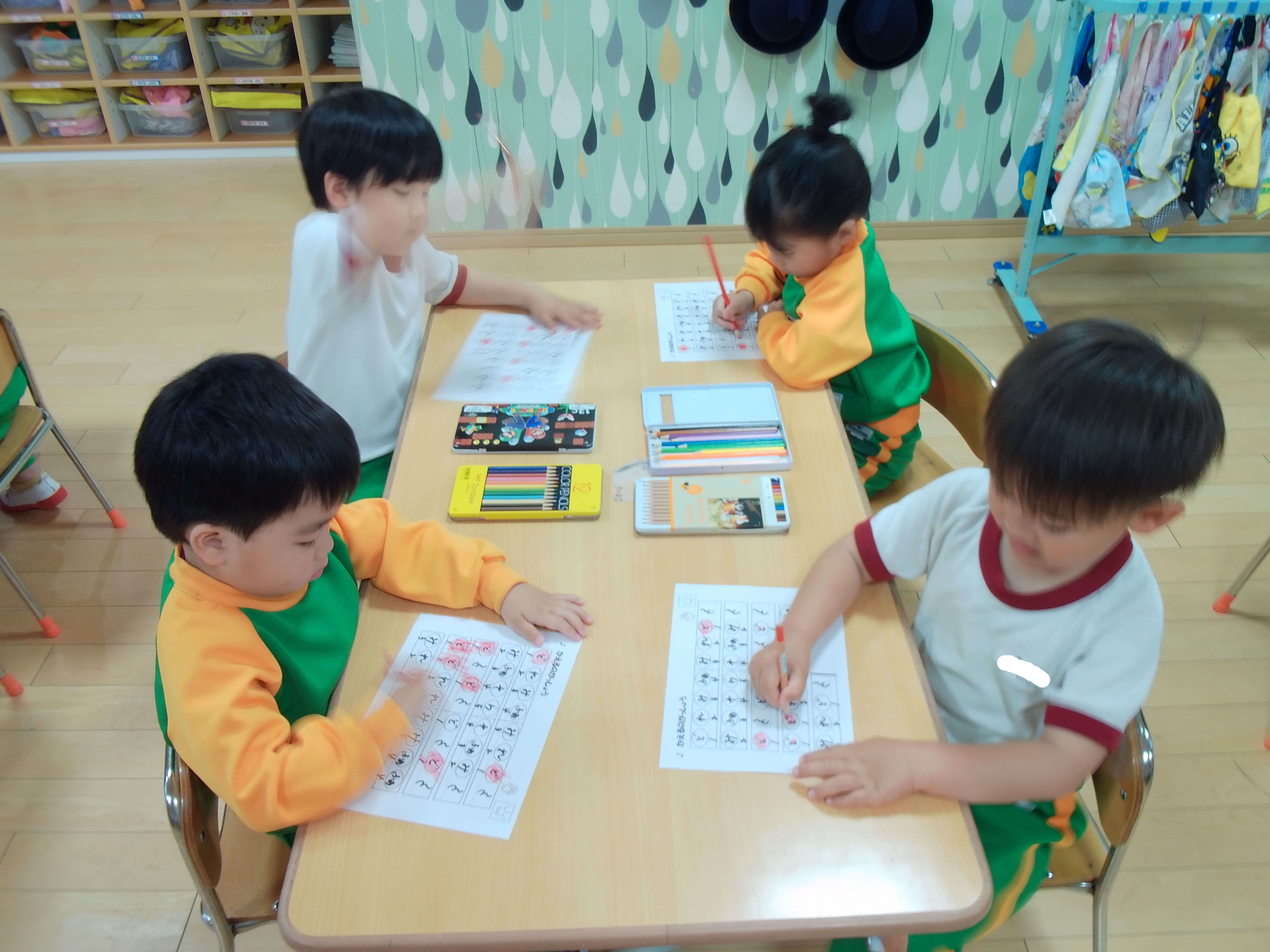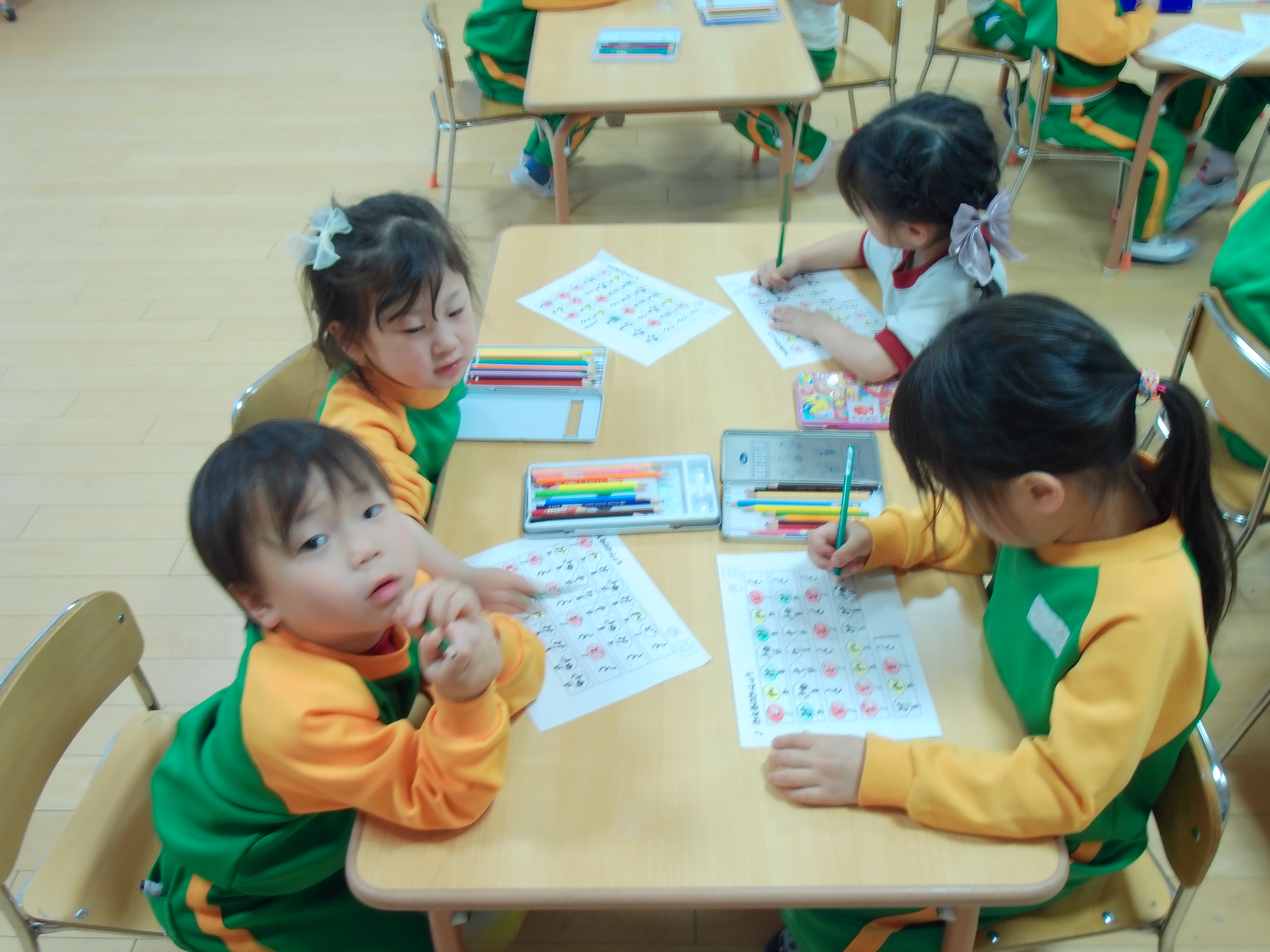 今日は、はじめてメロディオンの活動を行いました!「ど」は赤、「れ」は黄などの色を確認したあと、自分達で考えながら色を塗り 楽譜を完成させました☆