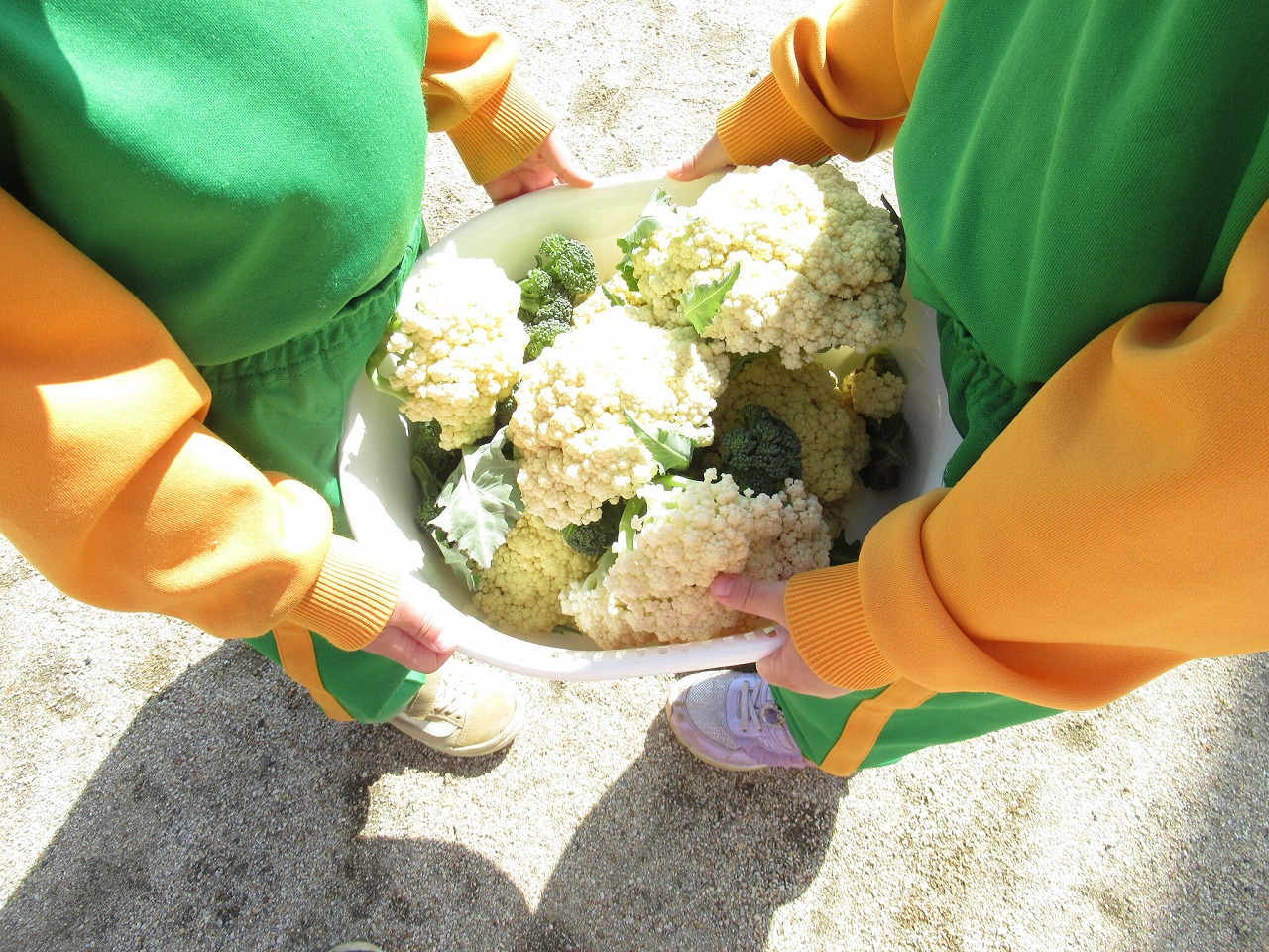 また別日には毎日、畑に行くことが日課になっている子どもたちと一緒にカリフラワーとブロッコリーの収穫をお手伝いしてもらいました♡