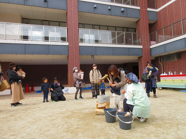 はじめてのお餅つき体験のお友だちも沢山いたようで、ノリノリでお餅をついてくれたお友だちも、少し緊張しながらお家の人と一緒についてくれたお友だちも、自分で作ったお餅を嬉しそうに持って帰ってくれていました♡