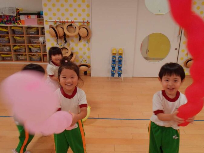今日はエレベーターに乗り、お遊戯室へ!お友だちと一列に並び、とっても上手に “でんしゃがっちゃん” することが出来たあひる1組さん♡